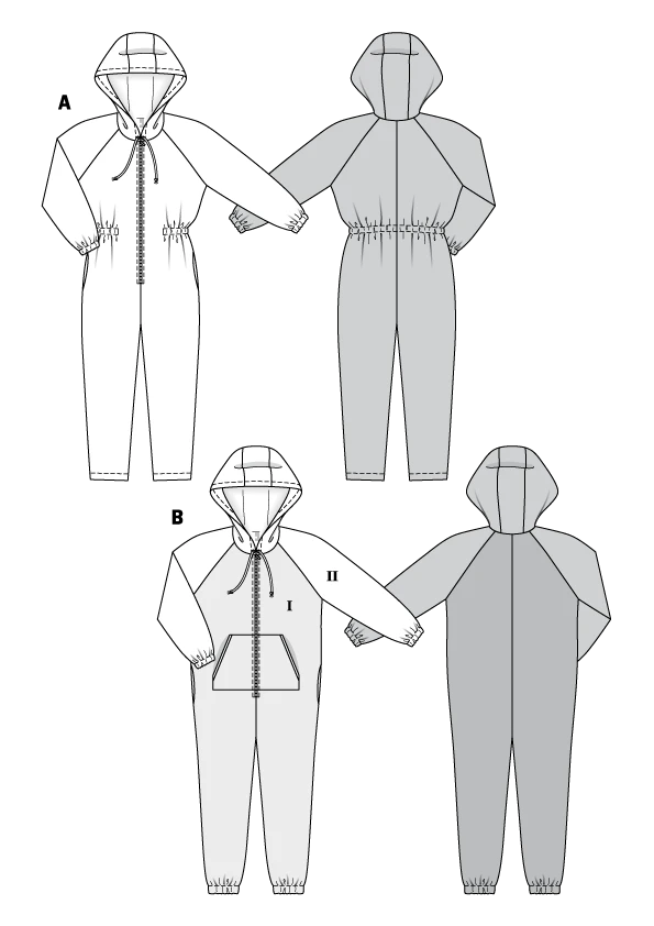 Relax at home in a comfy onesie sewn yourself – make it up in cuddly sweatshirting for both “Him” und “Her”. View A is detailed with elastic at the waist. View B sports a kangaroo pocket and is made up of two fabrics, tone in tone.