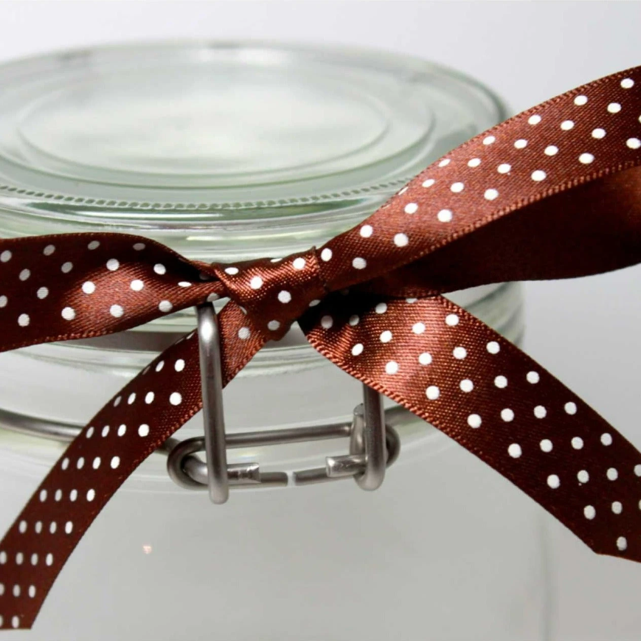 An attractive double face satin ribbon in Brown with White decorative dots.