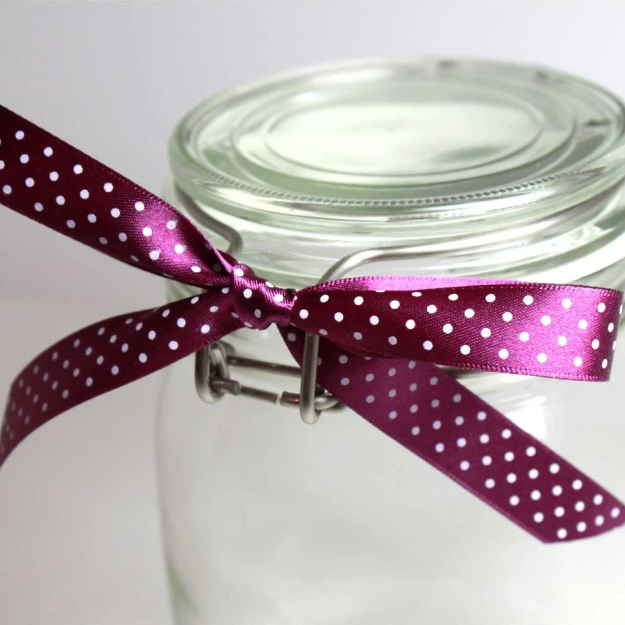 An attractive Plum colour double face satin ribbon with White decorative dots.
