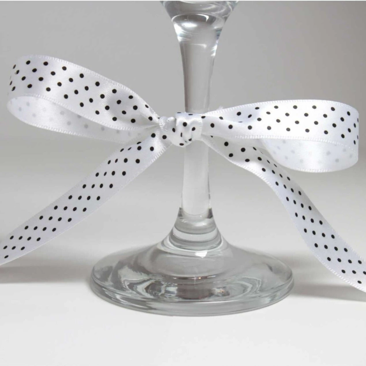 An attractive double face satin ribbon in White with Black decorative dot design.