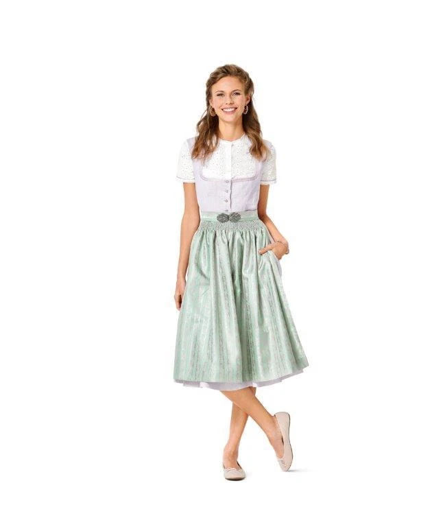 Two charming dirndls, choose a length just over the knee or midi. Decorative details such as trims, piping, ribbons and choice of fabric make all the difference here. You can also choose between two variations of dirndl blouses.