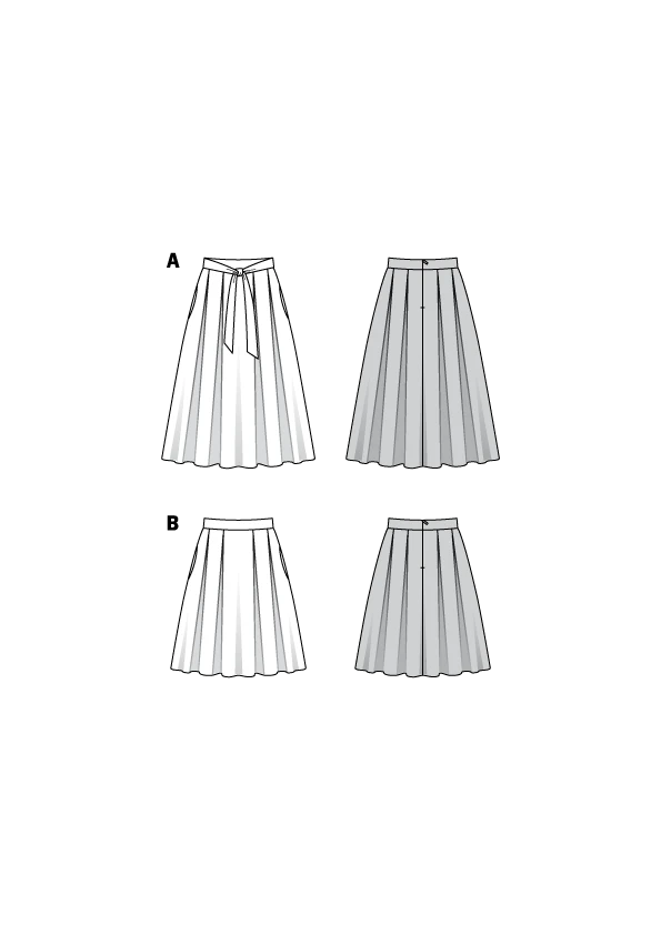 Pleated skirt in two lengths with inverted pleats slightly stitched together at the top and then left to open softly toward the bottom. Tie bands at the front waistband of skirt view A set a summery accent.