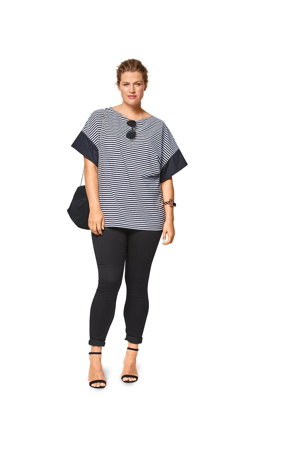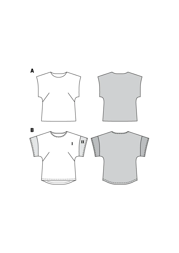 Make simple tops with a casual fit and integral sleeves – they’re sewn in a flash. Wear them tomorrow! They’re great to mix and match with narrow trousers. The short sleeves of view B are made up in contrasting fabric. The elongated back and curved hem are further fashion features.