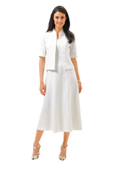 Wonderfully feminine yet still sleek, these dresses feature panel seams and are flared toward the hem. Choose between two lengths and either a round or square neckline. The nice short sleeve jacket with a stand collar underlines the sleek look.