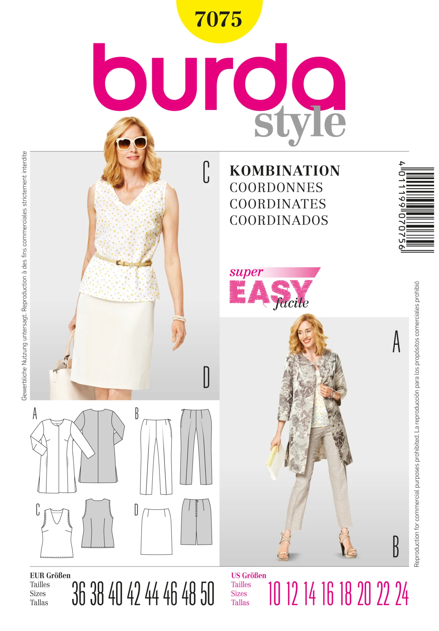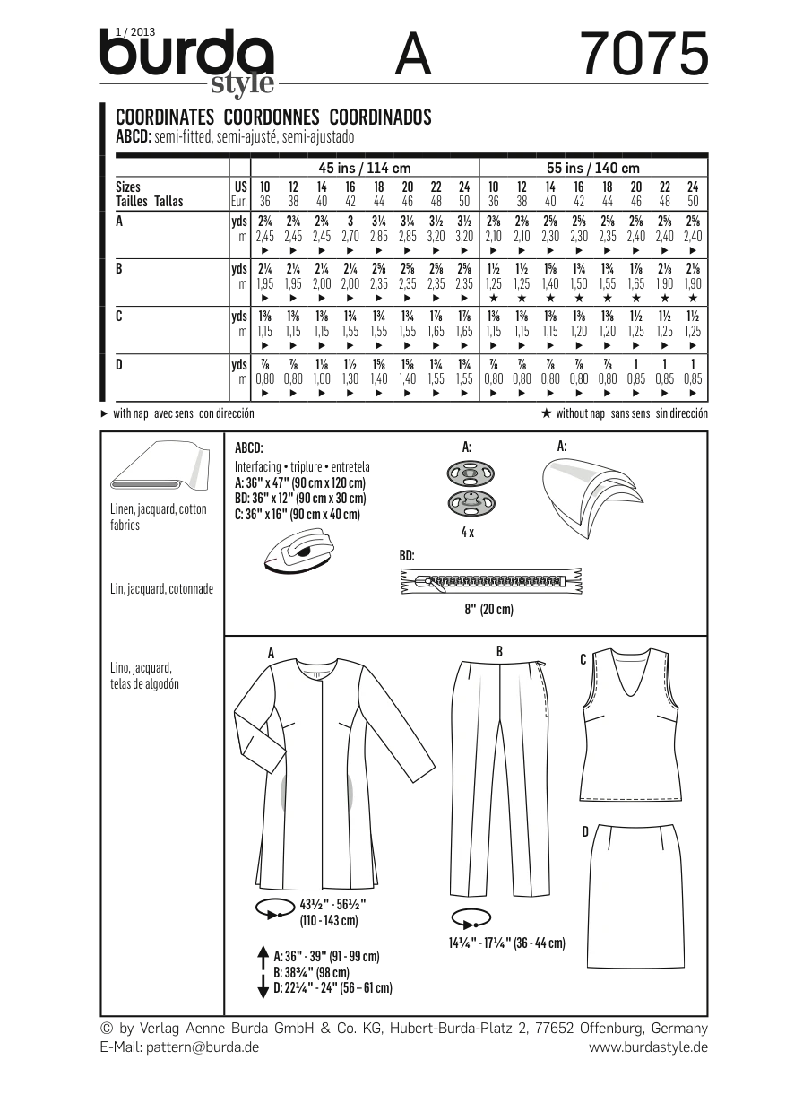 Elevate your wardrobe with the versatile Burda 7075 Sewing Pattern for Women, featuring patterns for a chic top, skirt, trousers, and jacket. With its easy-to-follow instructions, you’ll have a multitude of stylish coordinates at your fingertips.