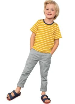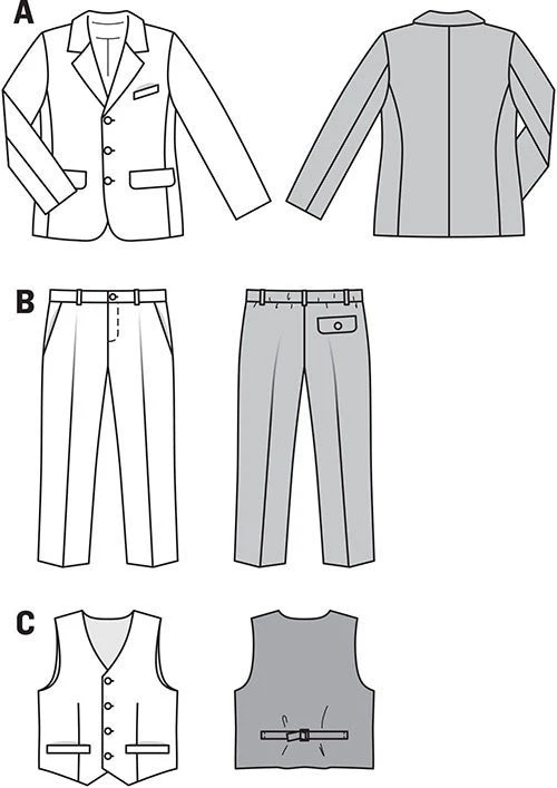 Dressed in a suit like dad. Jacket with lapels, flap pockets and small welt top left. Classic pants with crease and slant pockets. Vest with lined back and bar tack for festive occasions and weddings. Sewing level: advanced.