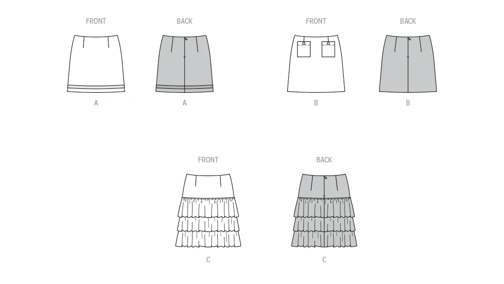 Fabric Suggestion : AB: Skirt fabrics with some stand, C: light, softly falling skirt fabrics.