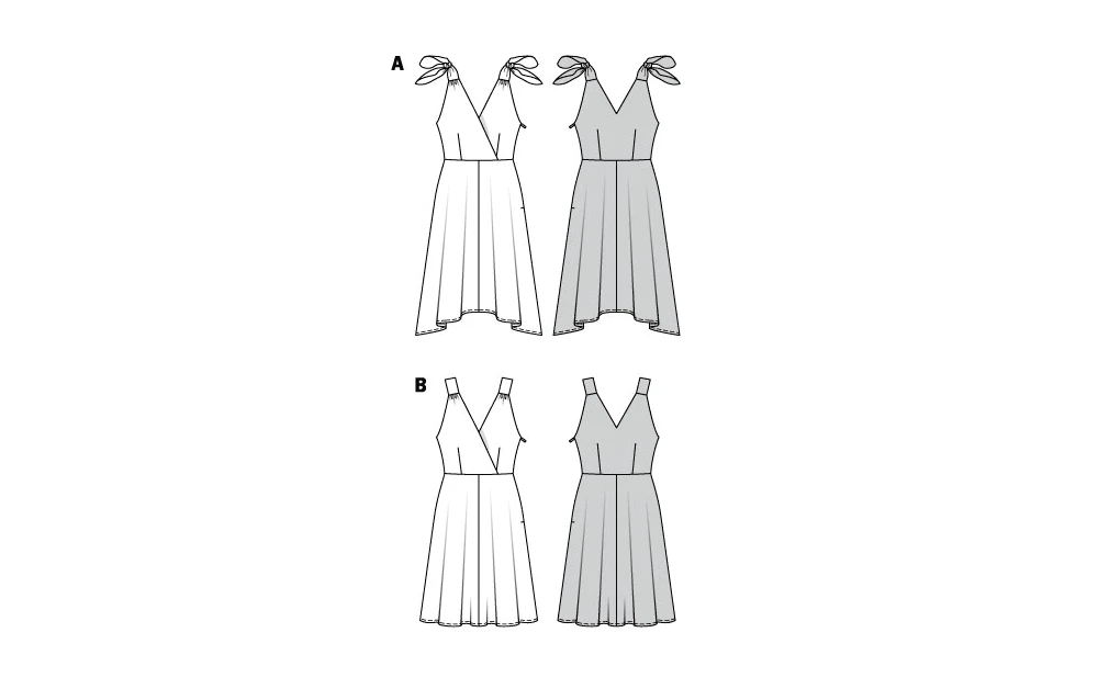 Burda sewing pattern for Enchanting summer dresses in mock wrap style will guarantee that easy summer feeling! The skirt of view A features a dipped hem and fanciful tie straps. View B has a straight hem line and simple straps. Both styles can easily be worn in the evening as well, depending on your choice of fabric.