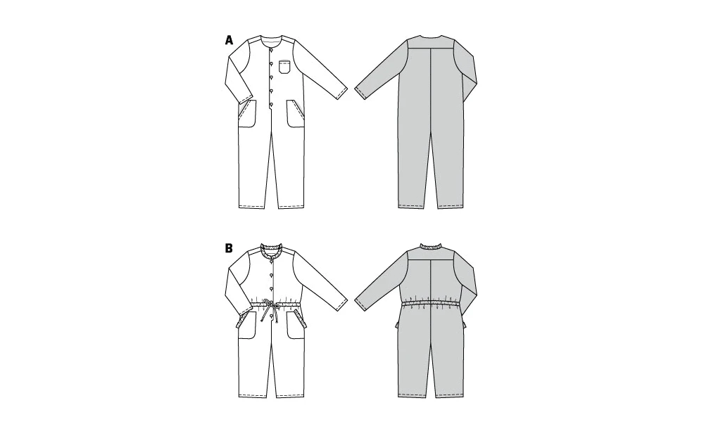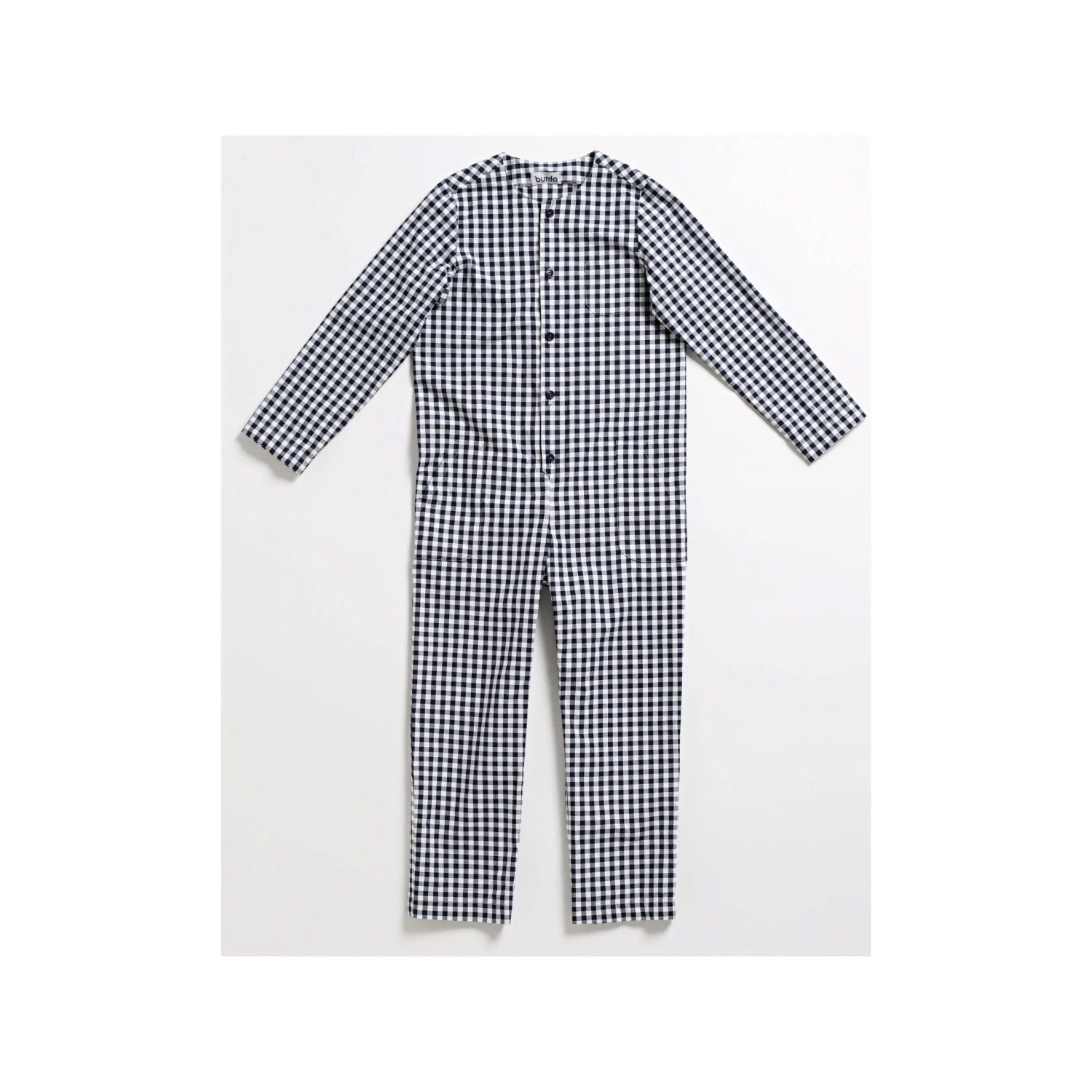 Burda sewing pattern for Comfortable jumpsuit with a button fastening and patch pockets – great for girls and boys alike. The onesie view B is given a more feminine touch with frills and a drawstring at the waist. The sleeves and legs of both styles can be scrunched or rolled for a casual look.