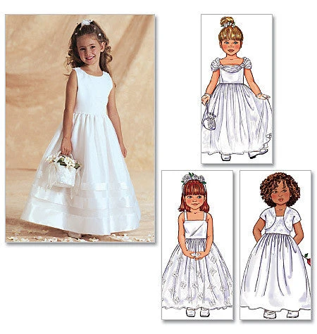 This sewing pattern features a girl’s bridesmaids dress and jacket set. The lined jacket has short sleeves and sits above the waist. The evening-length dress includes a close-fitting bodice, a flared dirndl skirt, tie-ends, and a back zipper. Options include purchased flowers, a contrast overskirt, contrast drape, and shoulder straps. Additional accessories like a petticoat, ribbon, and veil can be added. The design is ideal for weddings and other special occasions, offering a charming and elegant look for young bridesmaids.