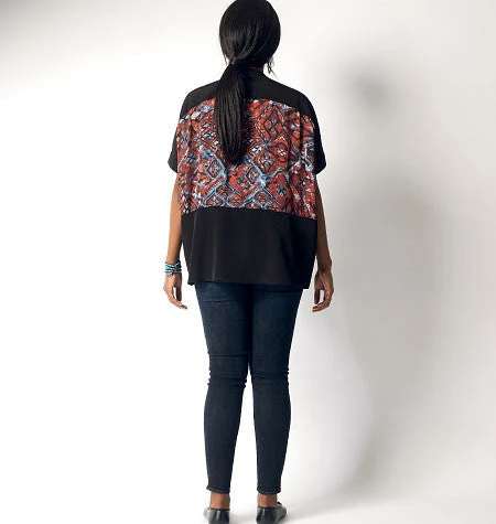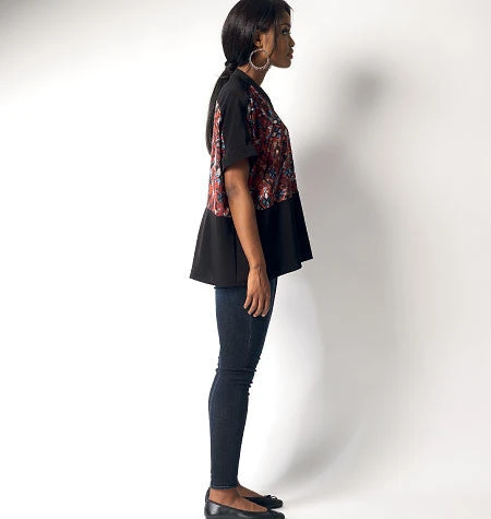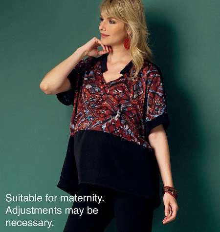 | MISSES’ TOP: Very loose-fitting, pullover top has back yoke with slightly forward shoulder seams extending into sleeves, shaped hemline (wrong side shows), and narrow hem. A: collar and bands. | |||||||