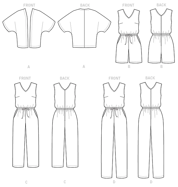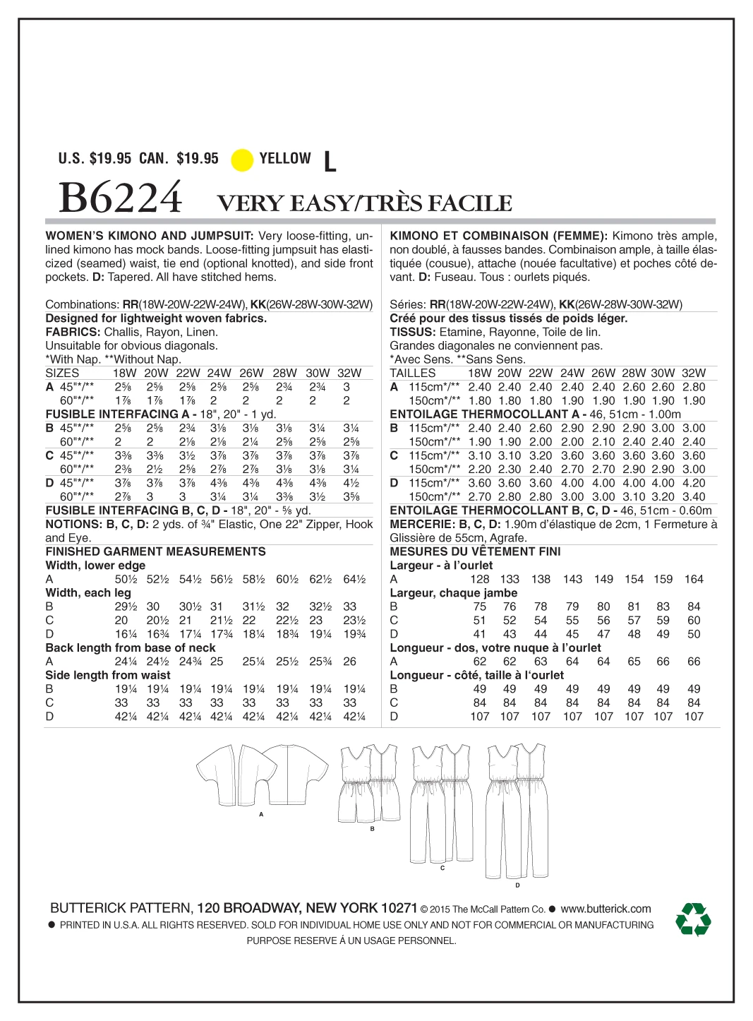 WOMEN’S KIMONO AND JUMPSUIT: Very loose-fitting, unlined kimono has mock-bands. Loose-fitting jumpsuit has elasticized (seamed) waist, tie end (optional knotted), and side front pockets. D: Tapered. All have stitched hems. Designed for lightweight woven fabrics. FABRICS: Challis, Rayon, Linens. *With Nap. **Without Nap. Unsuitable for obvious diagonals. NOTIONS: B, C, D: 2 yds. of 3/4” Elastic, One 22″ Zipper, Hook & Eye. Combinations: RR(18W-20W-22W-24W), KK(26W-28W-30W-32W)