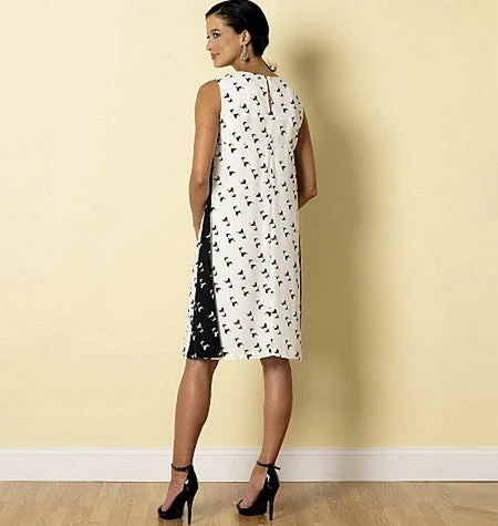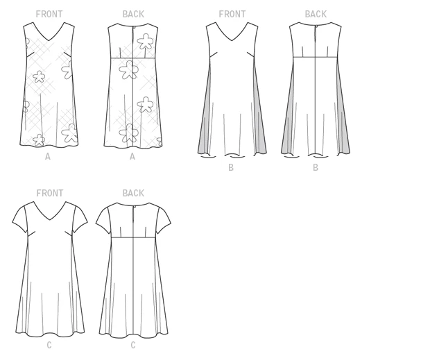 MISSES’ DRESS: Pullover dress (fitted through bust) has V-neckline, French darts, back neck slit closure, and button/thread loop. A: Underlined, semi-fitted through hips. A, B: Sleeveless. B: Contrast side panel. B, C: Loose-fitting through hips, self-lined upper back, side panels, no side seams. C: Self-lined cap sleeves. Designed for lightweight woven fabrics. FABRICS: A: Sheer Fabric, Lace, Eyelet. B, C, Underlining A: Faille, Crepe, Rayon, Challis, Linen. *With Nap. **Without Nap. Unsuitable for obvious diagonals. NOTIONS: A, B, C: One 3/8” Button. Size Combinations: A5(6-8-10-12-14), E5(14-16-18-20-22)