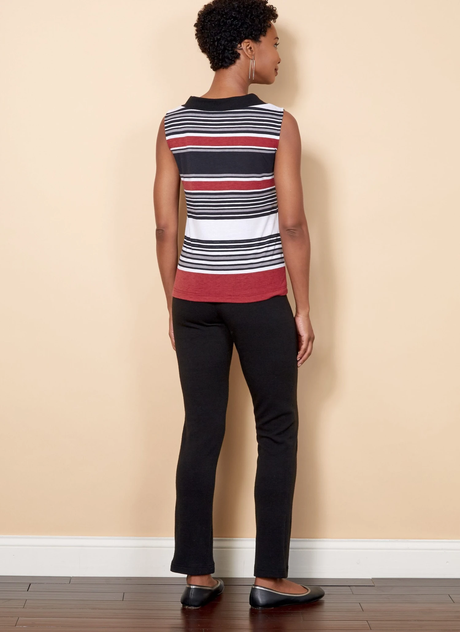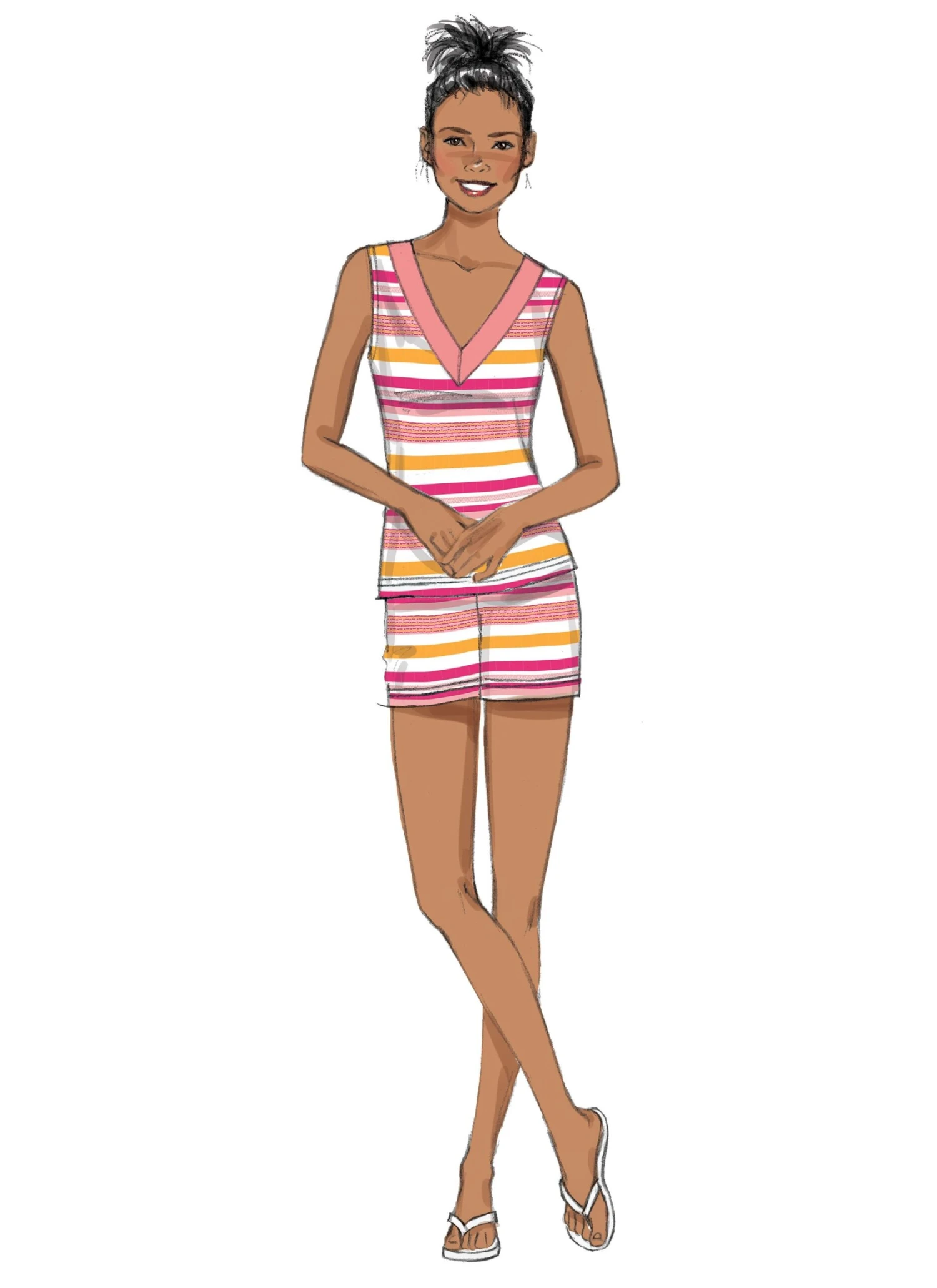 Loose-fitting jacket has shaped hemline and contrast neck and sleeve bands Close-fitting tops have contrast neck band and sleeve variations. Pull on shorts and pants have elasticized waist.