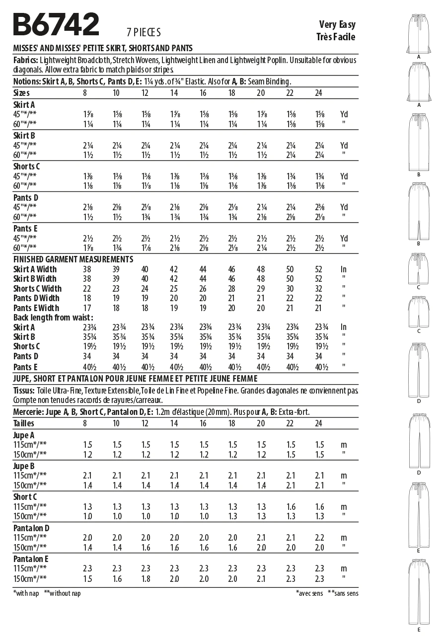 MISSES’/MISSES’ PETITE SKIRT, SHORTS AND PANTS Straight skirt or straight-legged, loose-fitting shorts and pants have elastic waist, attached ties, side pockets and stitched hem. A: below-knee, side slits. B: above ankle, back slit. C: above mid-knee. D: above ankle. Purchased top. NOTIONS: Skirt A, B, Shorts C, Pants D, E: 11/4 yds. of 3/4” Elastic. Also for A, B: Seam Binding. FABRICS: Lightweight Broadcloth, Stretch Wovens, Lightweight Linen and Lightweight Poplin. Unsuitable for obvious diagonals. Allow extra fabric to match plaids or stripes. Use nap yardages/layouts for pile, shaded or one-way design fabrics. *With nap.**w/o nap. MULTI – SIZED FOR CUSTOM FIT