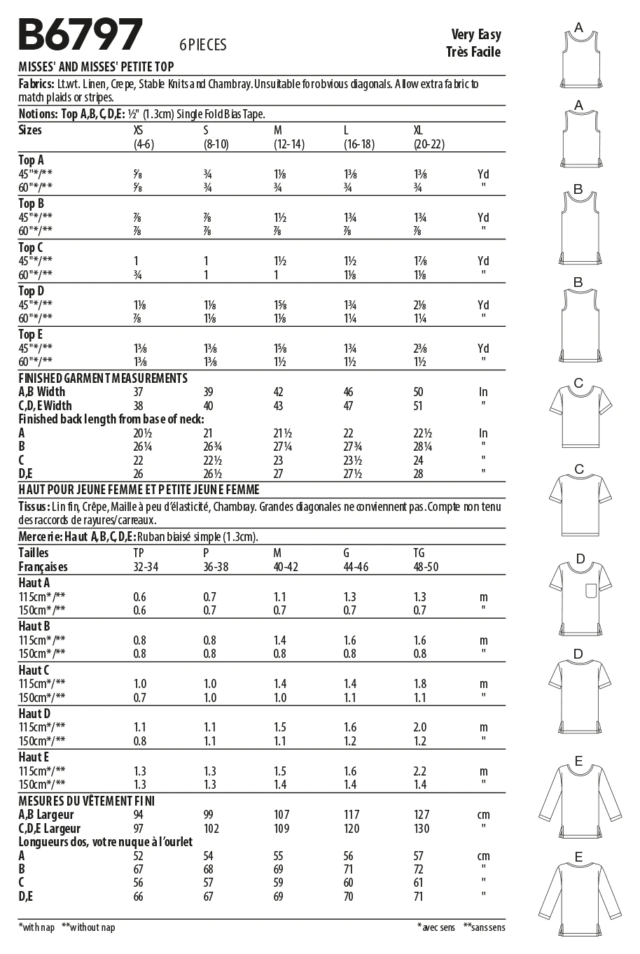 MISSES’/MISSES’ PETITE TOP Loose-fitting, pullover top has stitched hems and length variations. A,B,D,E: side slits. A,B: sleeveless. C,D: short sleeves. E: three-quarter sleeves. D: pocket. FABRICS: Lt.wt. Linen, Crepe, Stable Knits and Chambray. Unsuitable for obvious diagonals. Allow extra fabric to match plaids or stripes. *with nap. **w/o nap. WIDTHS/LENGTHS: Width at Lower Edge: Top A,B 37 to 50″ (94 to 127cm), Top C,D,E 38 to 51″ (97 to 130cm). Back Length from Base of your Neck: Top A 20 1/2 to 22 1/2″ (52 to 57cm), Top B 26 1/4 to 28 1/4″ (67 to 72cm), Top C 22 to 24″ (56 to 61cm), Top D,E 26 to 28″ (66 to 71cm). See pattern envelope for additional information.