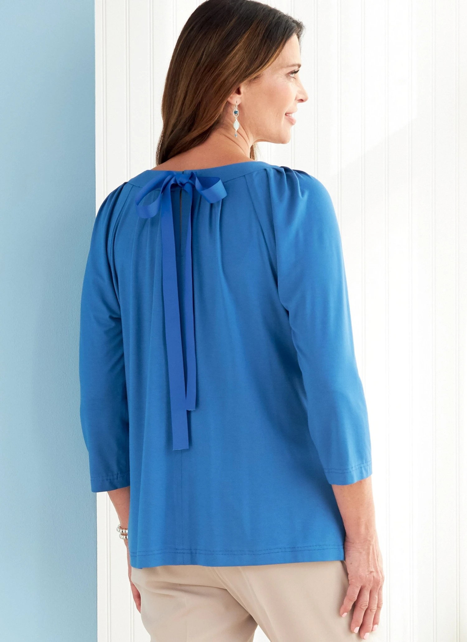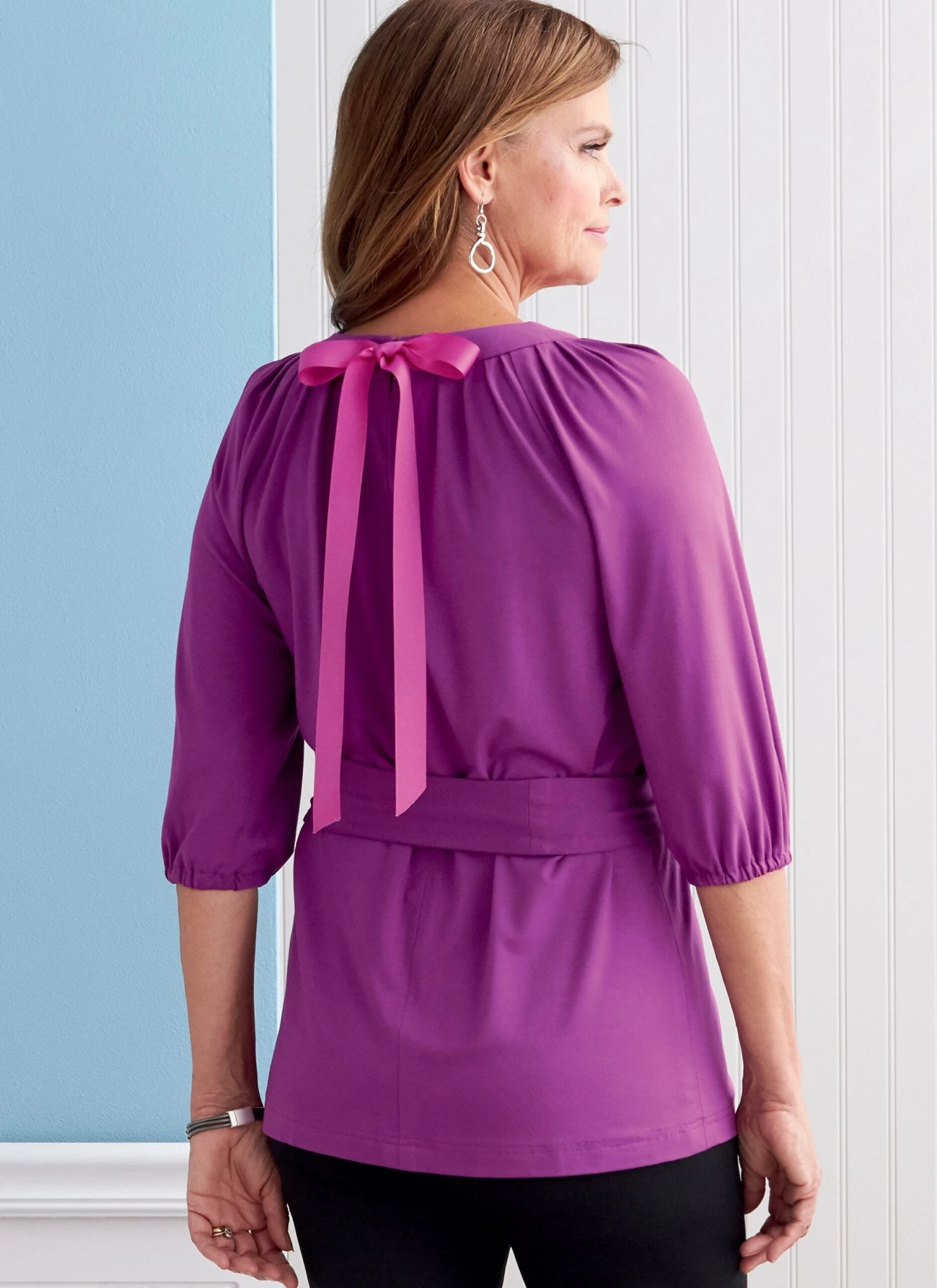 Butterick Sewing pattern, for Misses’ knit top with front neck pleats, back tie opening, sleeve variations and sash.