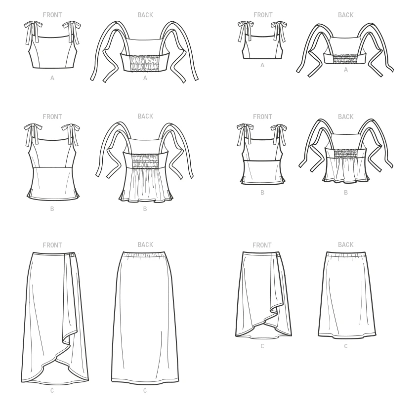 Butterick sewing pattern for Pull-over cropped top with elastic shirred back has shoulder ties. Raised waist top ends at high hip and has elastic shirred back, side slits, shoulder ties. Pull-on skirt has front drape that starts above knee and in the back dips to mid calf.