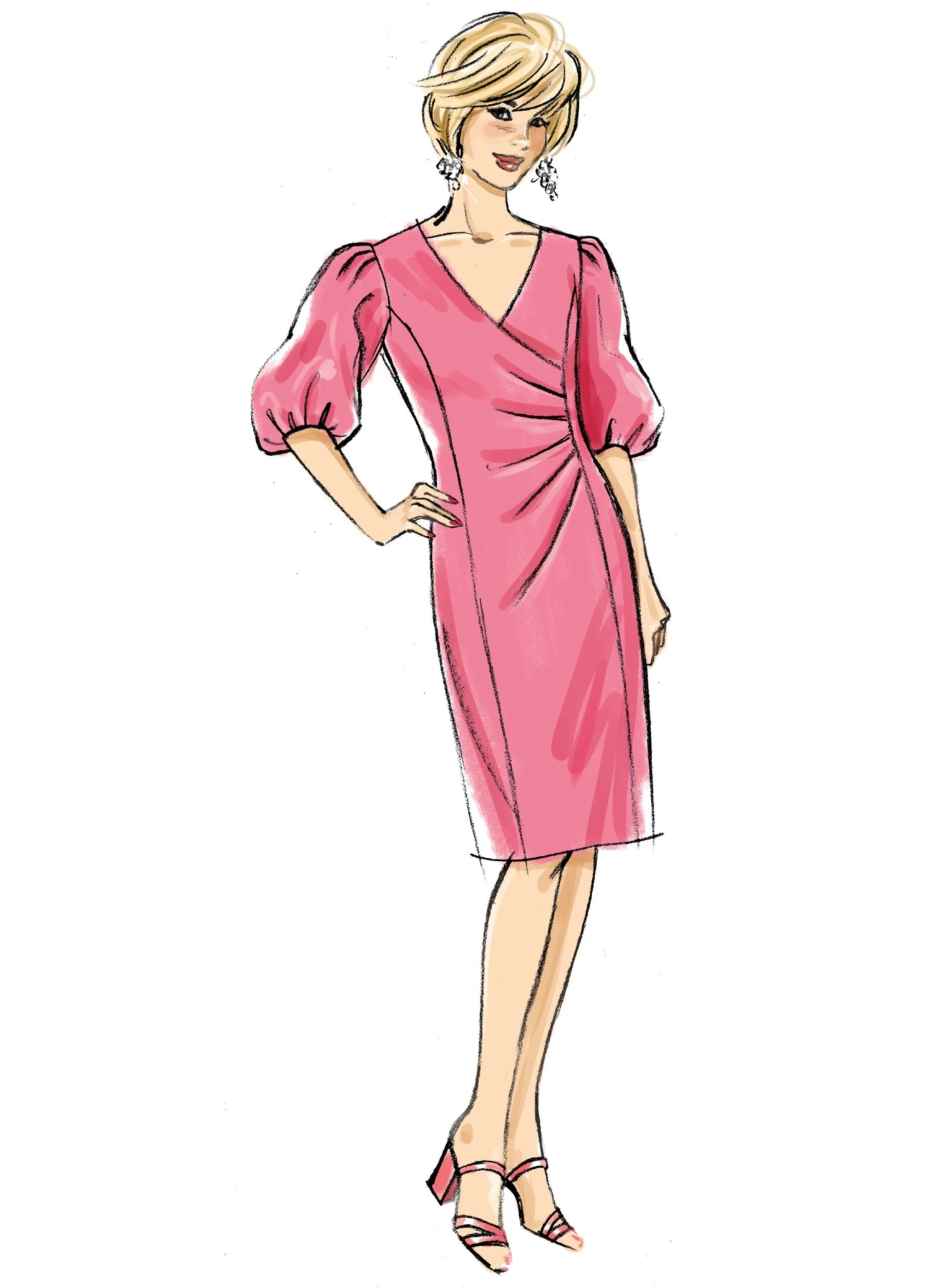 Princess seam dress in two lengths has side front pleat detail. View A has side front drape and view C has full sleeves with pleats. Dress has back invisible zipper.