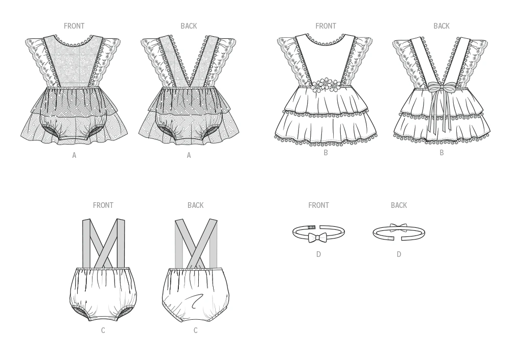 Sewing pattern for Adorable baby rompers have snap tape opening and elastic casing at waist and legs. Views A and B have bib, skirt and purchased lace trim. View C romper has contrast straps. Complete the outfit with the matching bow tie!