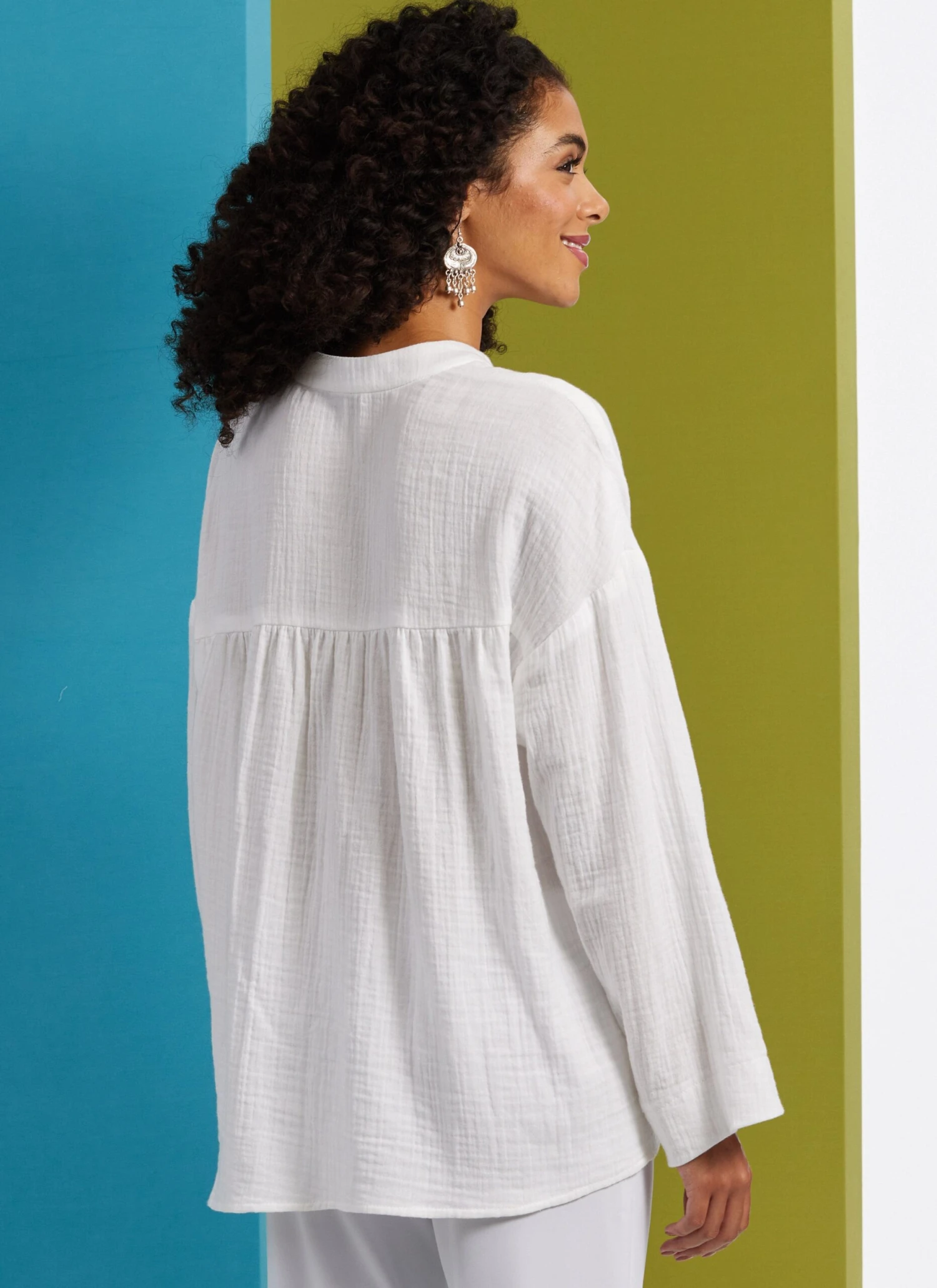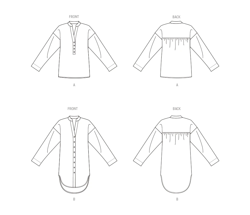 Very loose-fitting top or tunic has dropped shoulders, long sleeves, neck band, front button closure, and length and hemline variations. View A has front placket. View B has front band and shaped high low hem.
