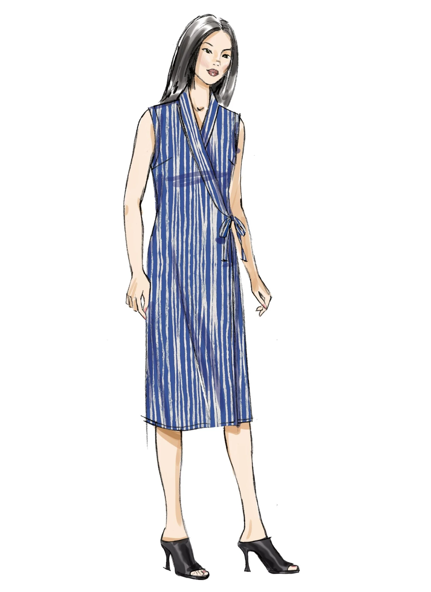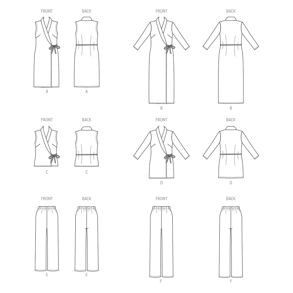 Butterick Sewing Pattern for Straight wrap dress and top have bands, darts, tie closure and can be long sleeve or sleeveless. Straight legged pants have elastic waist and stitched hems.
