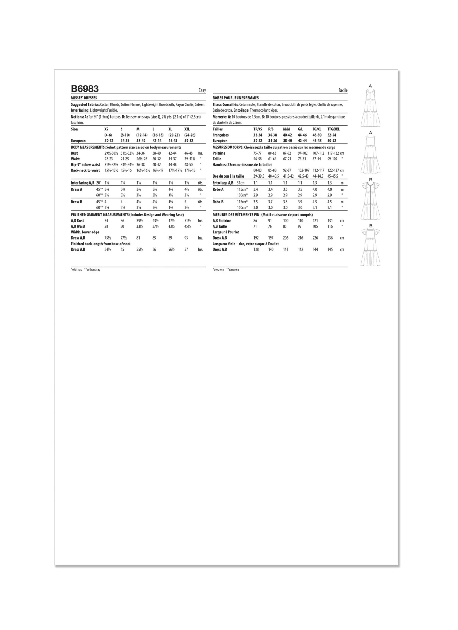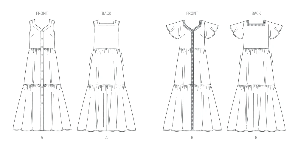 Easily create a dress or day coverup with Butterick pattern B6983. These dresses feature a tiered hem and front/back neck facings, with bust darts for a fitted look. View A has a button front and sleeveless design with self-bias armhole facings, while View B has a concealed snap front closure, short flared sleeves, and added trim for a unique touch.