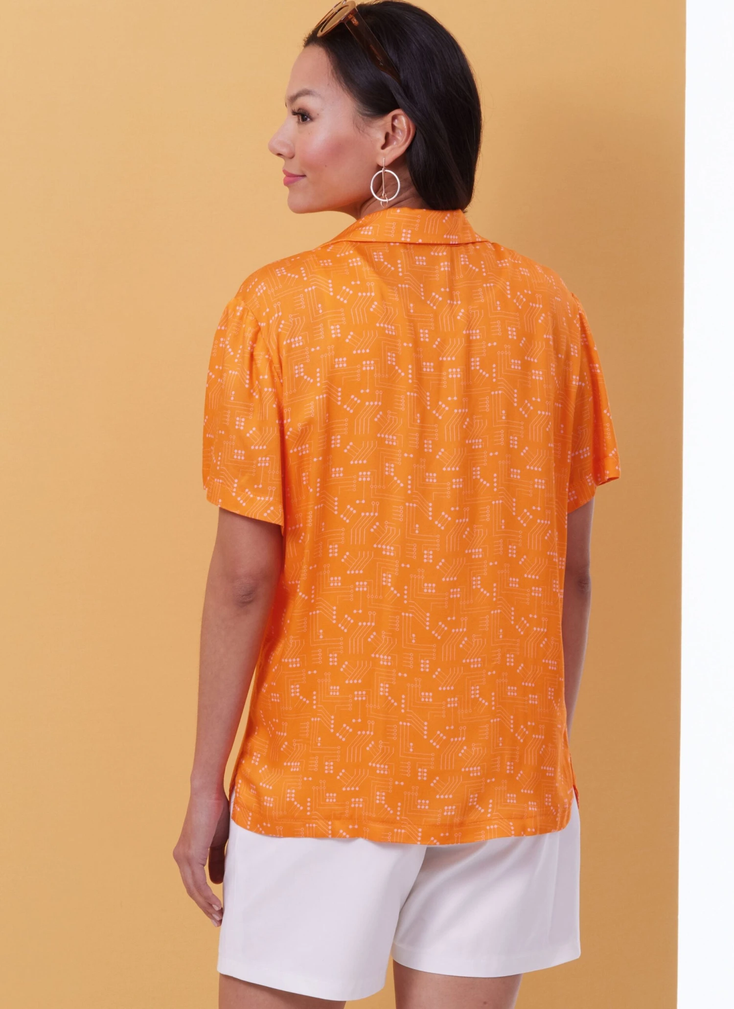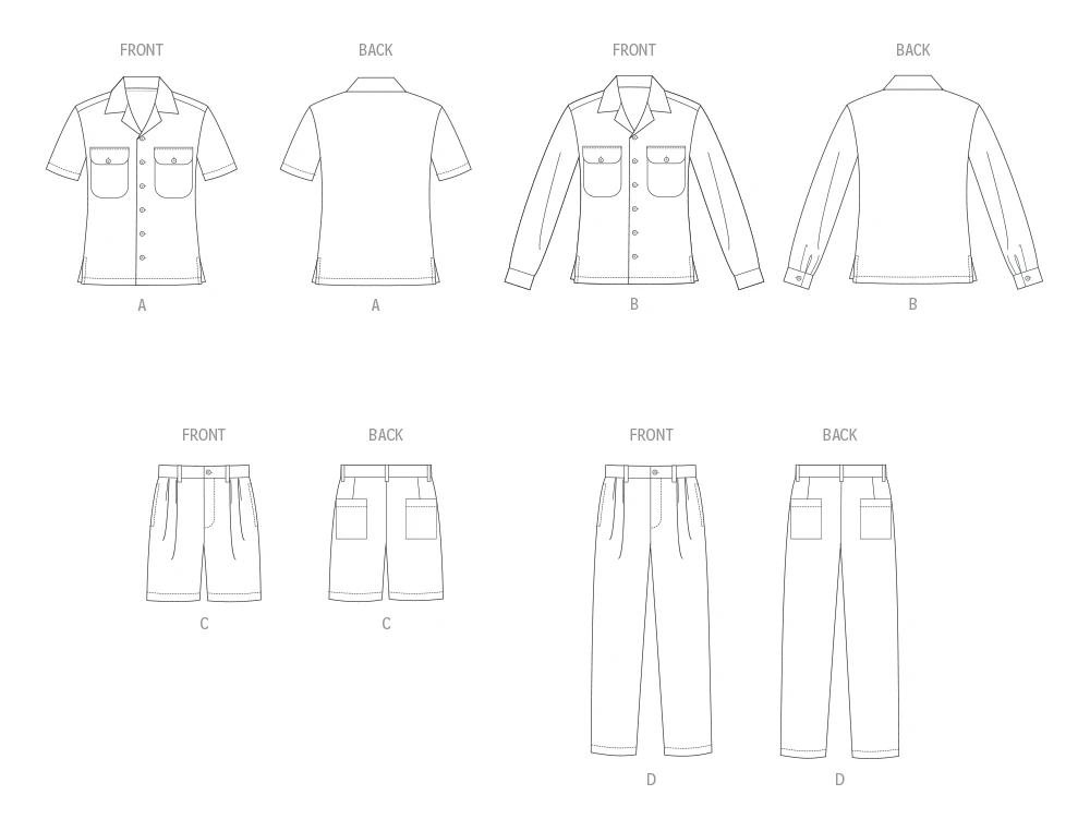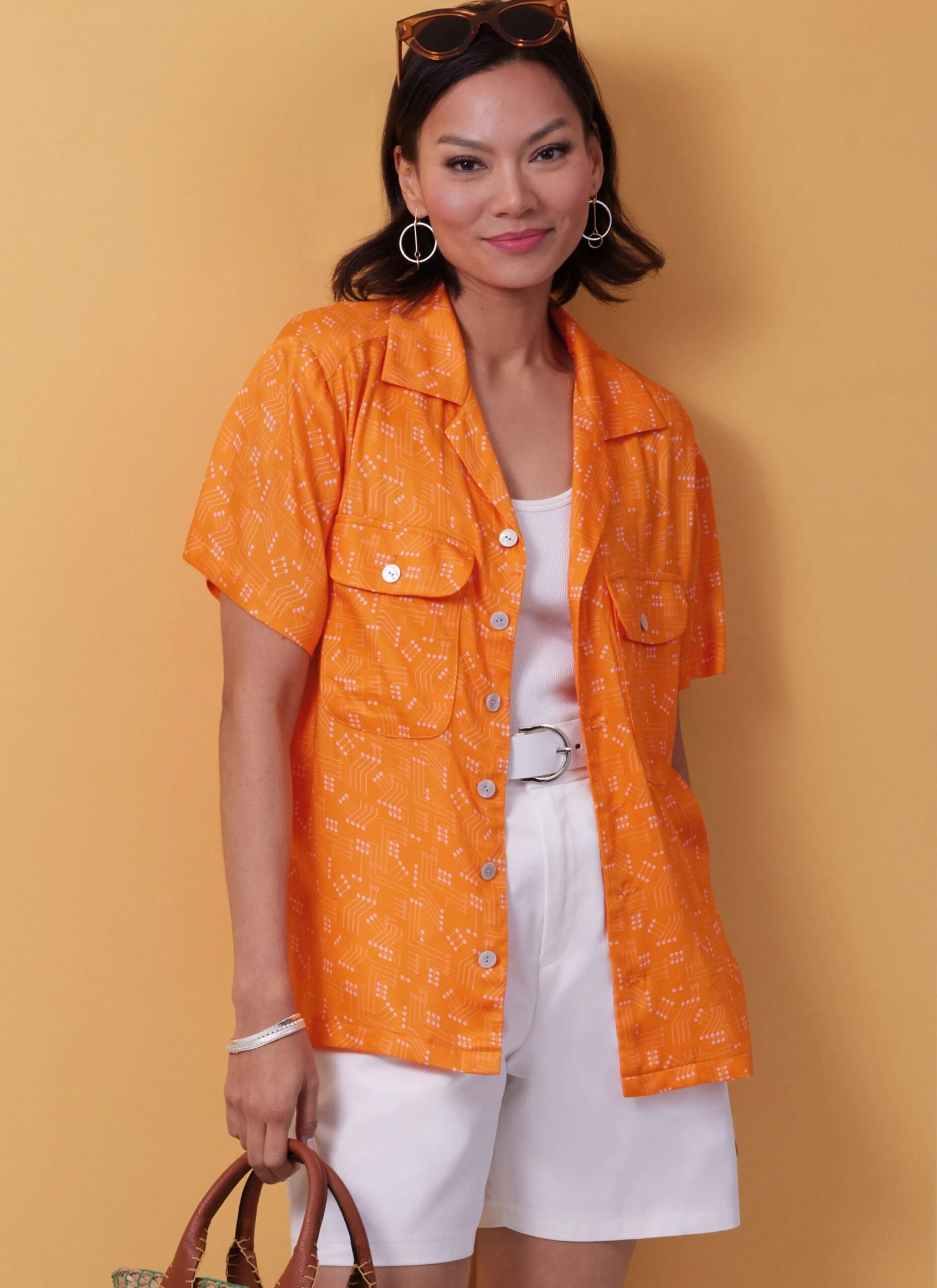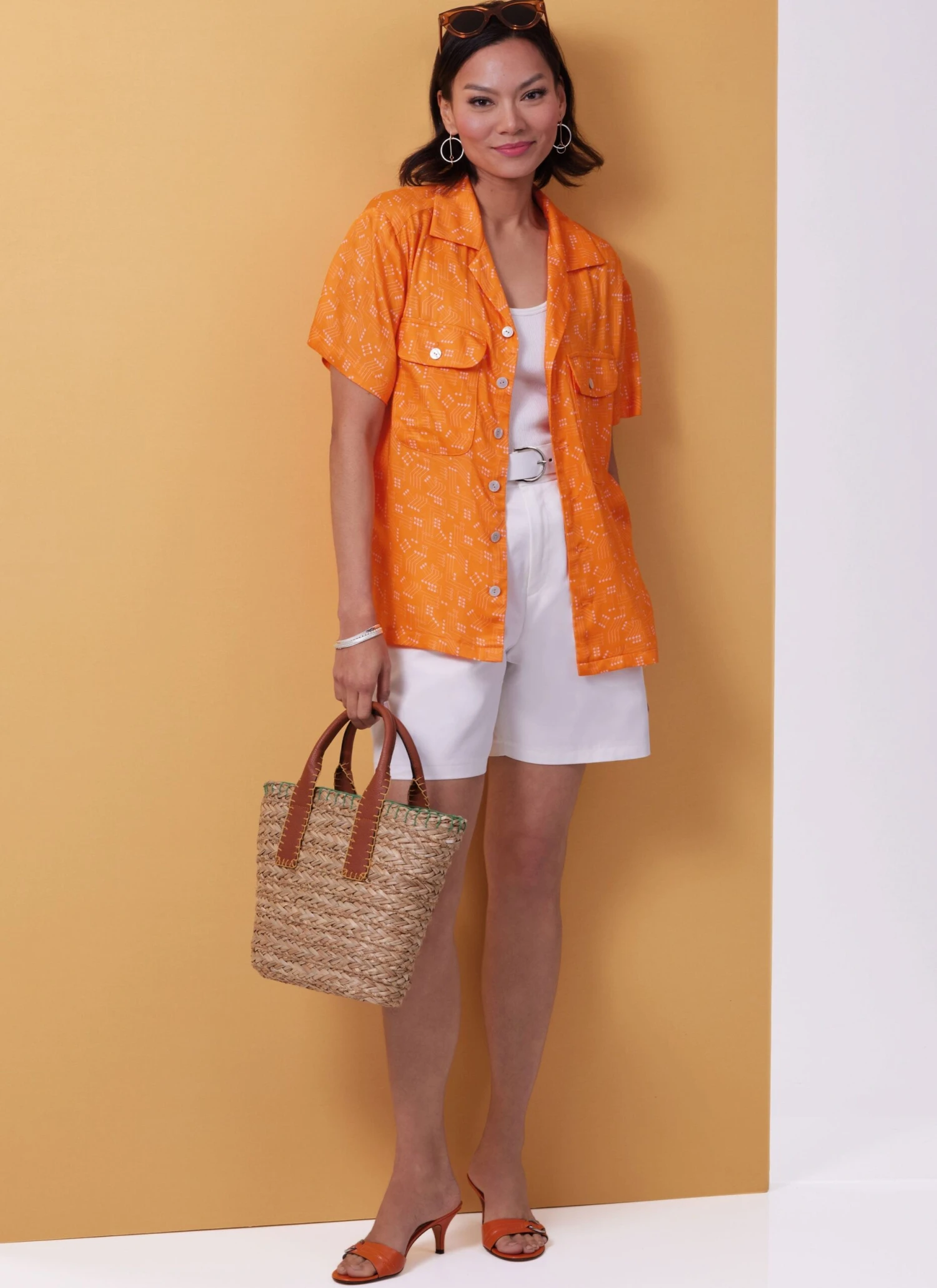 Butterick Sewing Pattern for Loose-fitting camp collar shirt has forward shoulder seams, patch pockets with buttoned flaps, side slits, stitched hems and sleeve length variation. Loose-fitting pleated shorts or pants, sit below waist, have fly front zipper, side seam pockets, belt loops, back patch pockets and stitched hems.