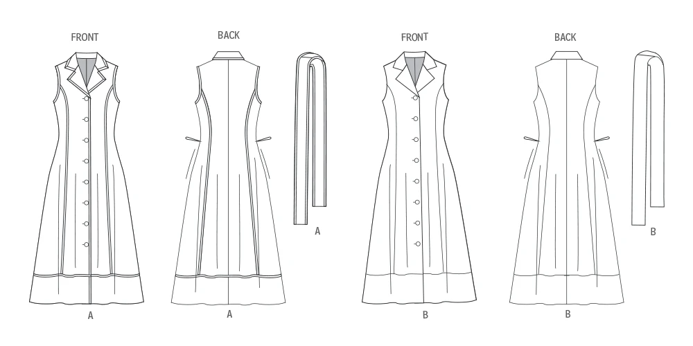 Butterick Sewing Pattern for Lined, midi length fit and flare dress, close-fitting through bust, has notch collar, button front opening, side seam pockets, hem band, tie belt and thread loops. View A has purchased bias trim.