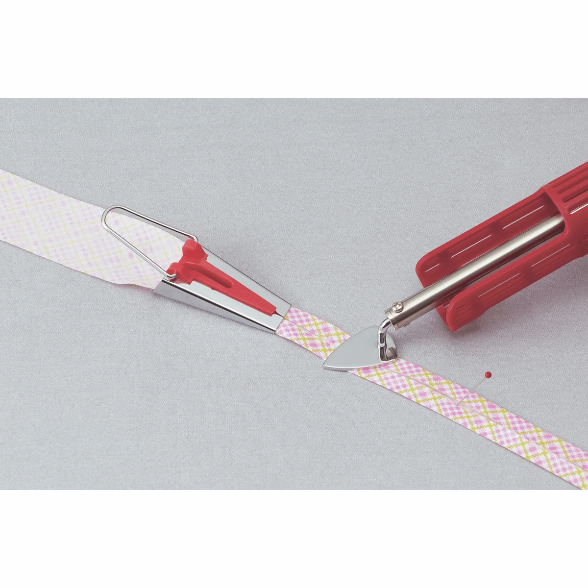 Make perfect bias binding in minutes. Cut the fabric according to its purpose. Pass the cut fabric through the tape maker – using a tailor’s awl helps Fasten fabric edges with pins, then iron the folded tape as you pull the tape maker.