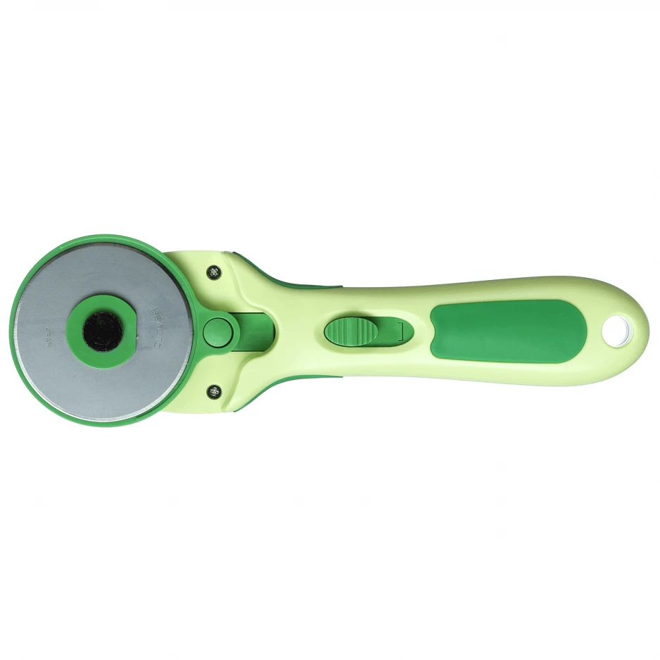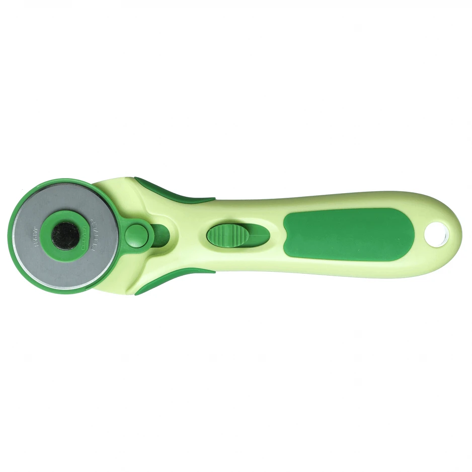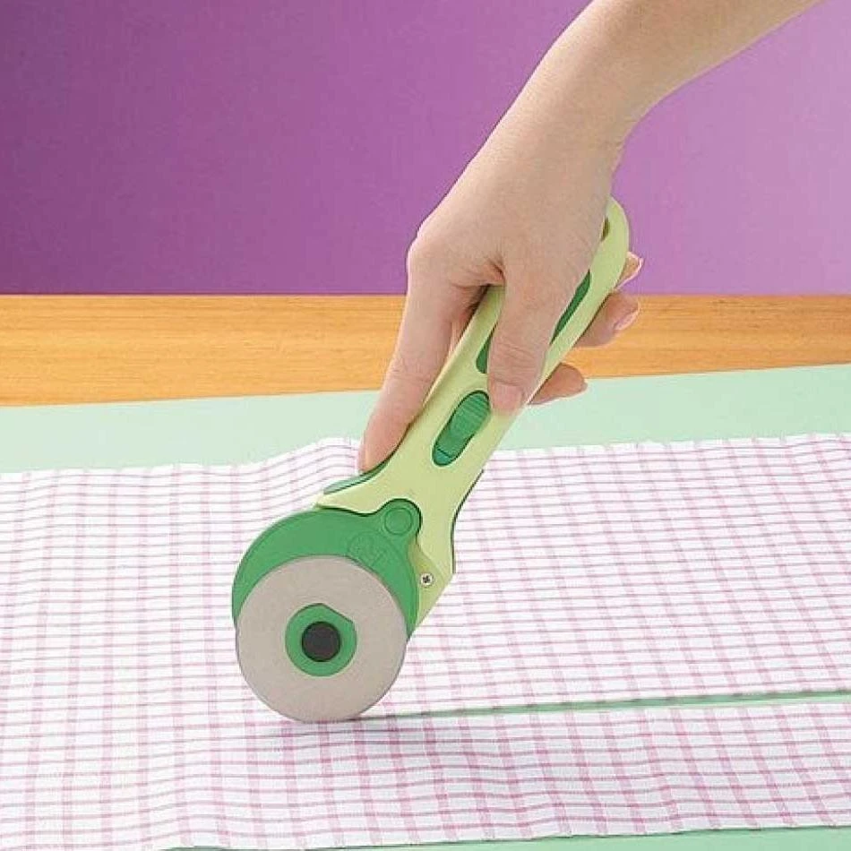 Soft cushion handle rotary cutter cuts fabric beautifully with just the right amount of blade exposed, whether held upright or at an angle. For Right and Left handers.