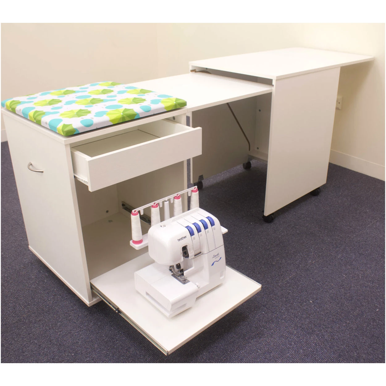 - Sliding shelf to store your Overlocker with a drawer for accessories.