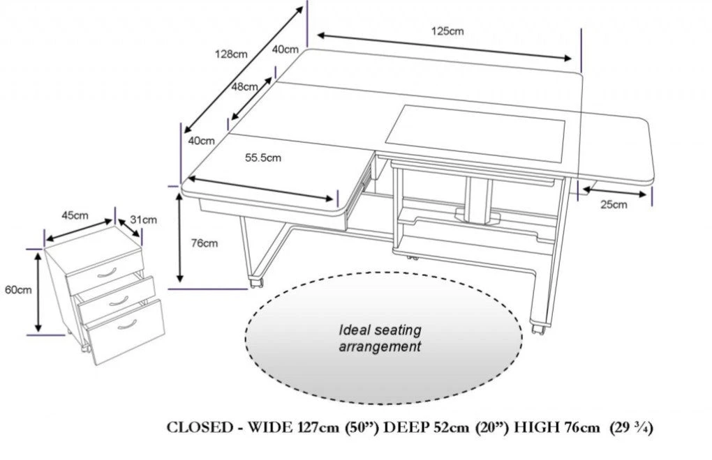 A uniquely designed quilting table for you and your sewing machine. Providing a large and well supported sewing area, a separate drawer storage unit and the Horn Maxi-Lifter which is large enough to accommodate virtually all domestic sewing machines on the market, or old or new!