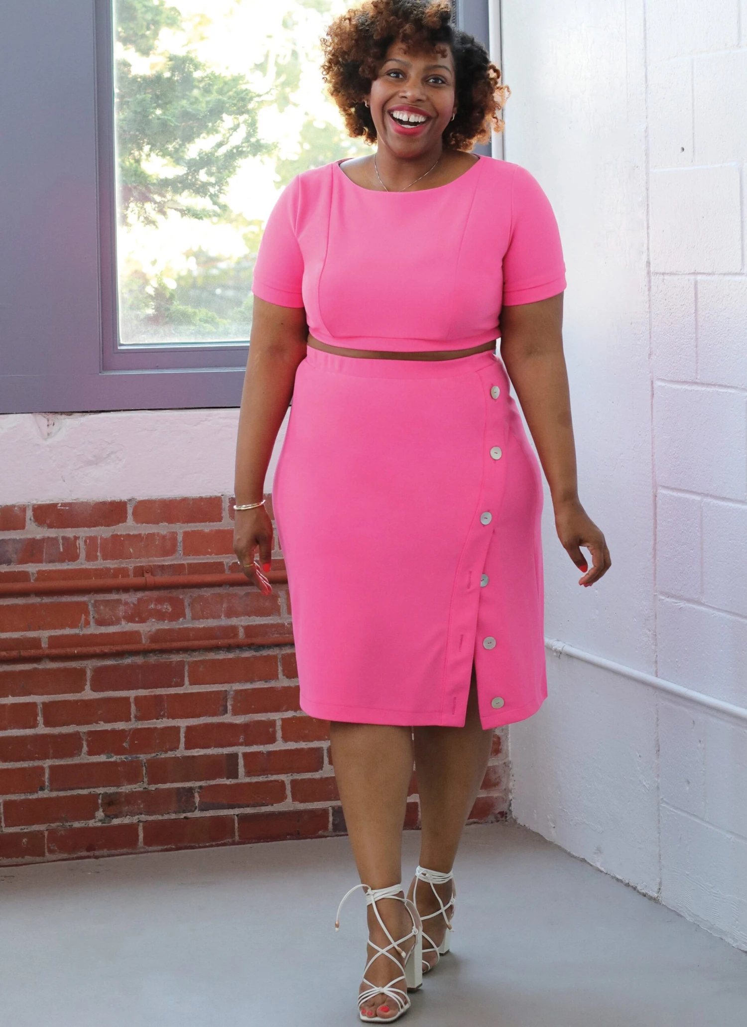 Knit top and skirt set features top with square or scoop neckline and sleeve variations plus a high waist skirt in two lengths with asymmetrical button detail.