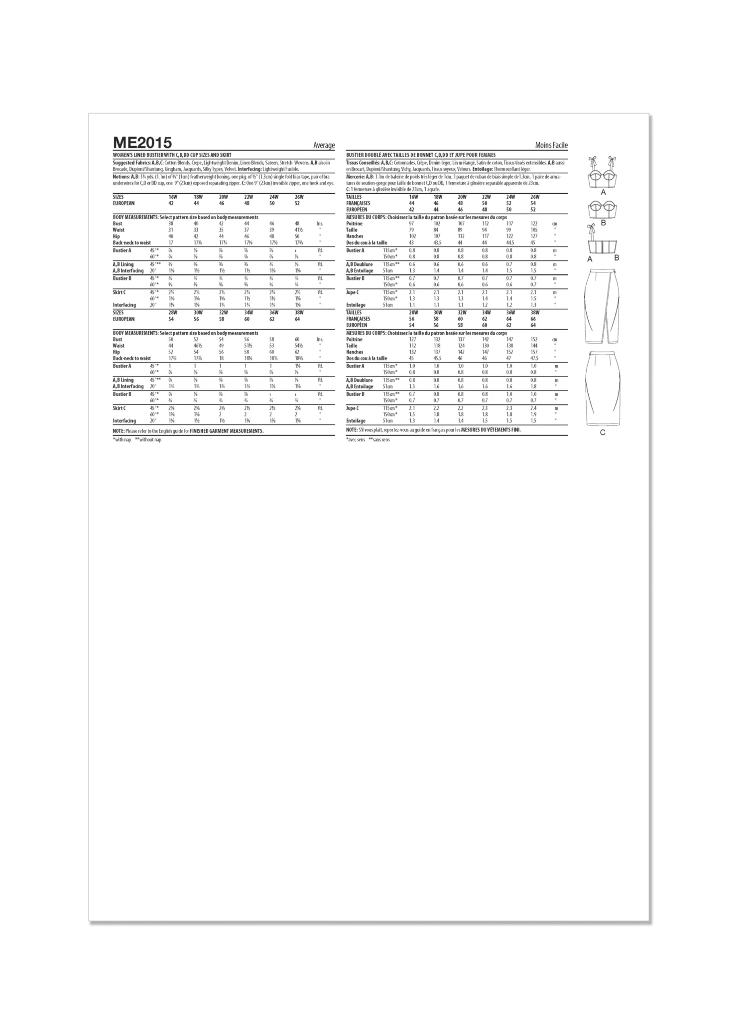 Bustier top with optional straps has boning at front and side seams. Pencil skirt with high slit has a crossover at the front and an invisible side zipper. Separate pattern pieces are included for cup sizes C, D and DD.