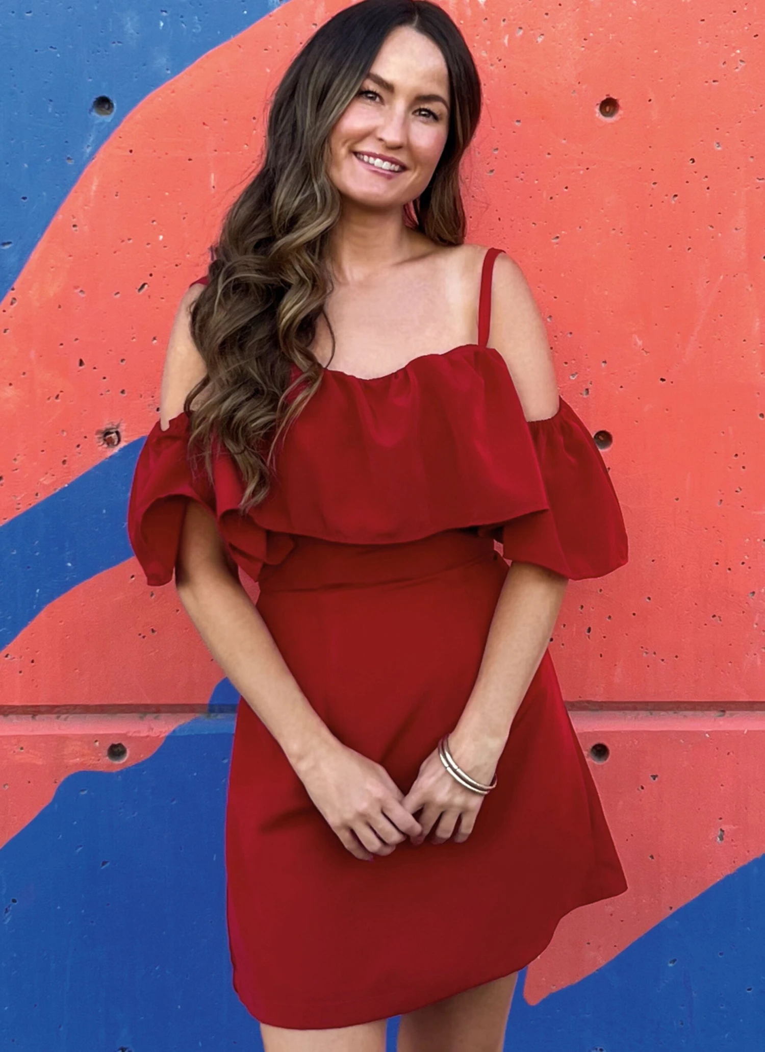 Off the shoulder ruffle dress in two lengths has lined bodice, boning at waist, sweetheart neckline with elastic, optional straps and invisible back zipper.