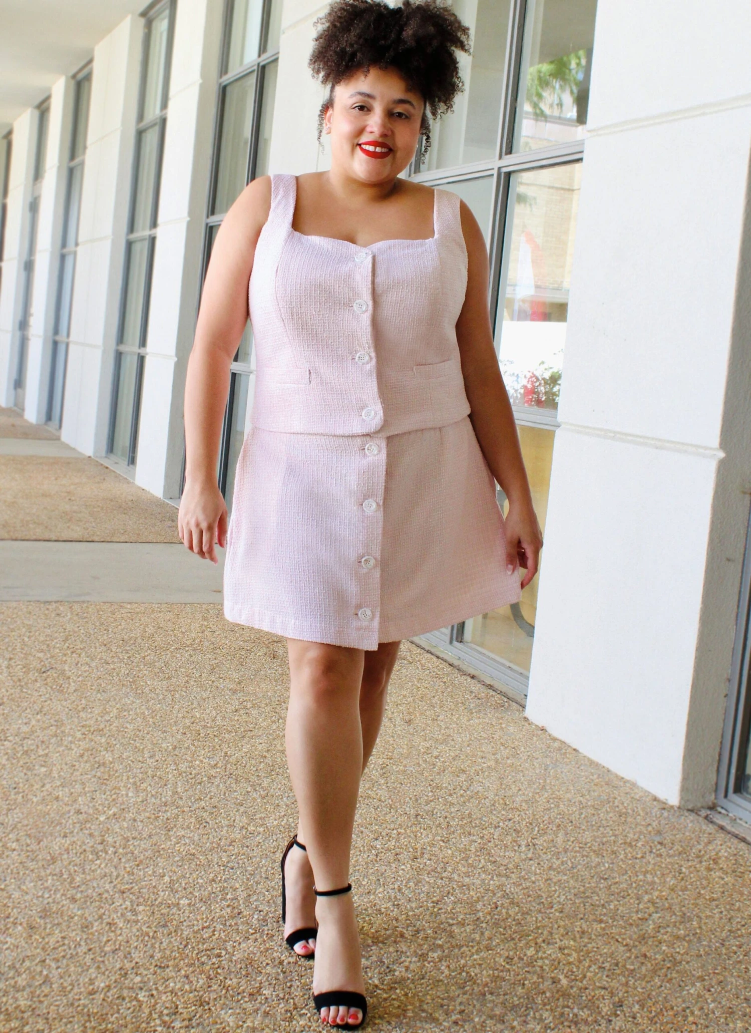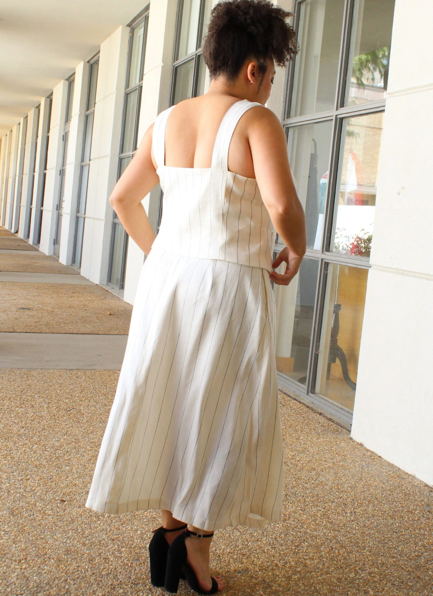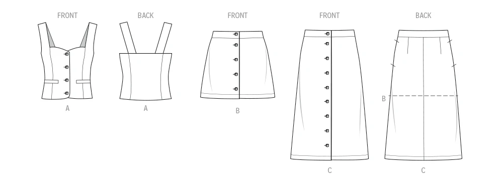 Sewing Pattern for Fitted, coordinate set with matching top and skirts. Top with wide straps has sweetheart neckline, princess seams, front button closure and faux welt pockets. A-line skirts in mini or midi length have front button closure, back darts and side seam pockets. Separate pattern pieces for A/B, C, D cup sizes.