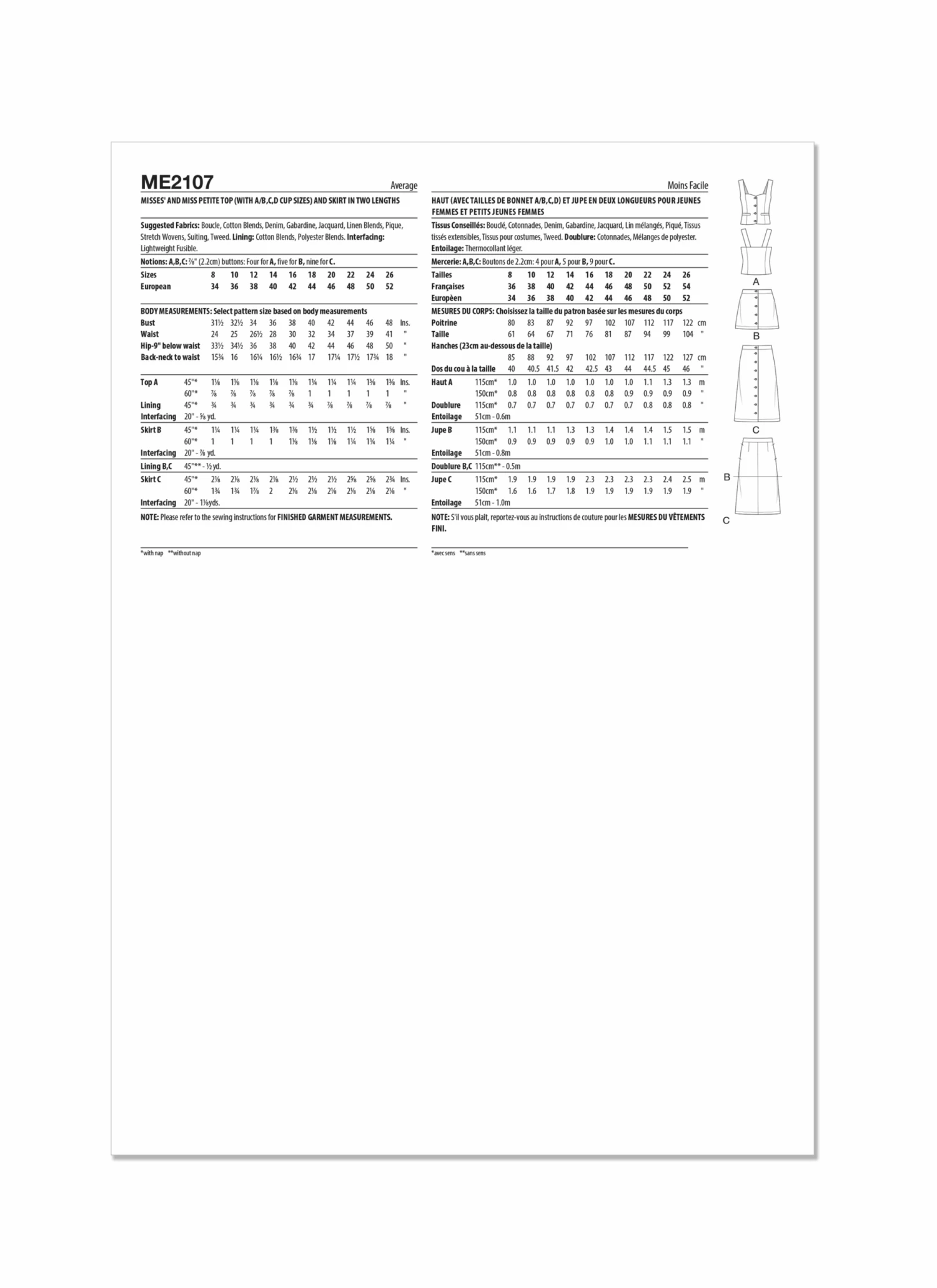 Fabric Suggestion : Boucle, Cotton Blends, Denim, Gabardine, Jacquard, Linen Blends, Pique, Stretch Wovens, Suiting, Tweed. Lining: Cotton Blends, Polyester Blends. Interfacing: Lightweight Fusible.