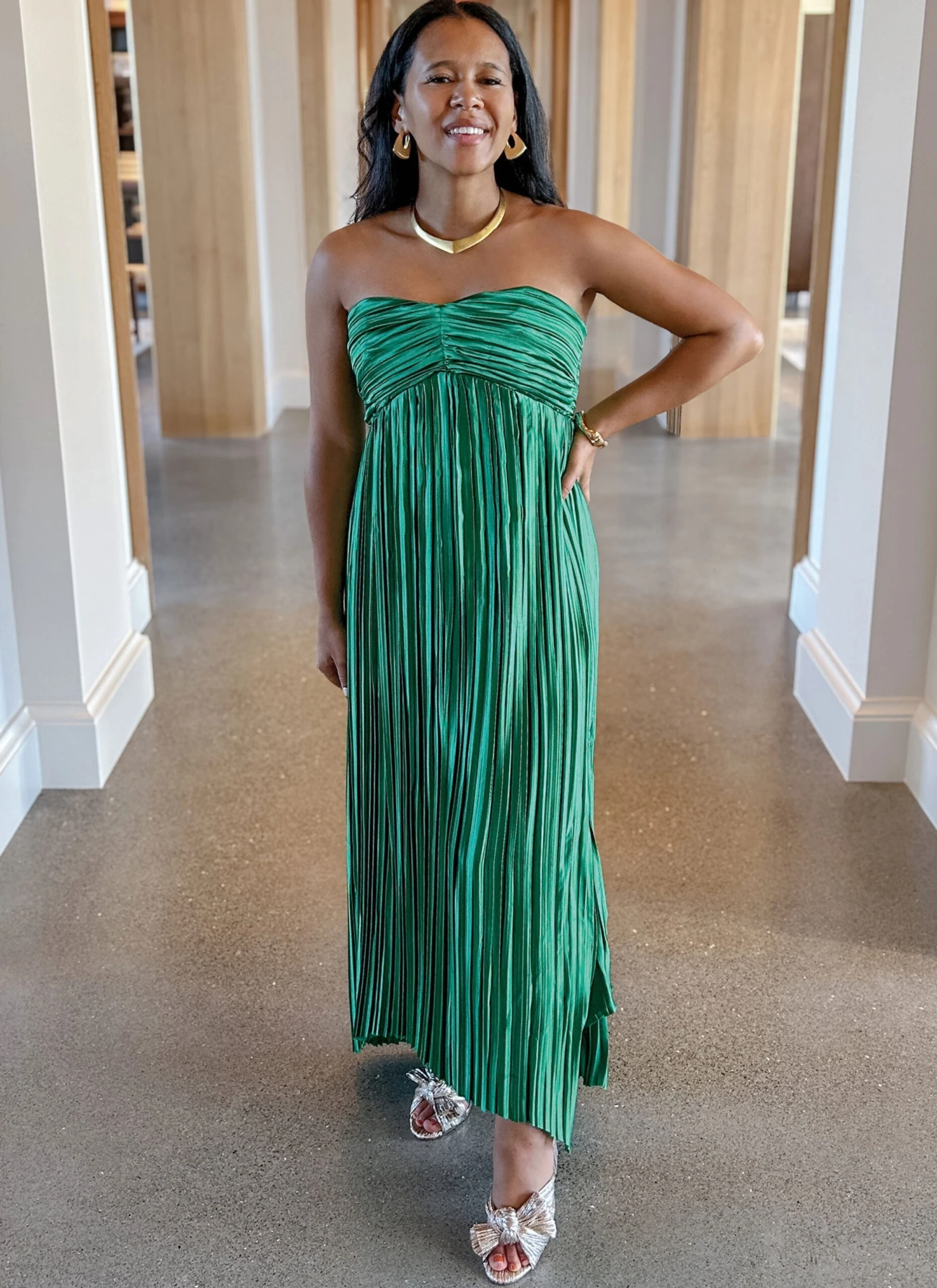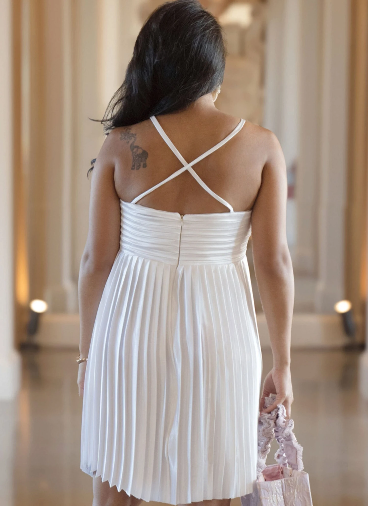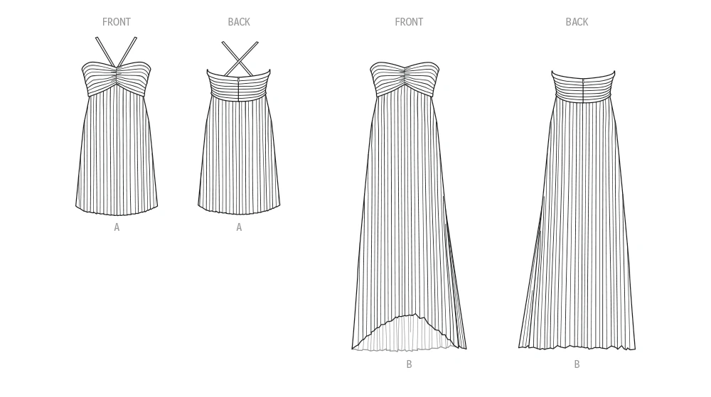 Sewing Pattern for Pleated lined dress in babydoll or full-length have hidden corset with angled bust detail and invisible back zipper closure. View A has halter straps that cross at the back and rounded shaped hem. View B is strapless with slight high low hem and thigh high skirt slit.