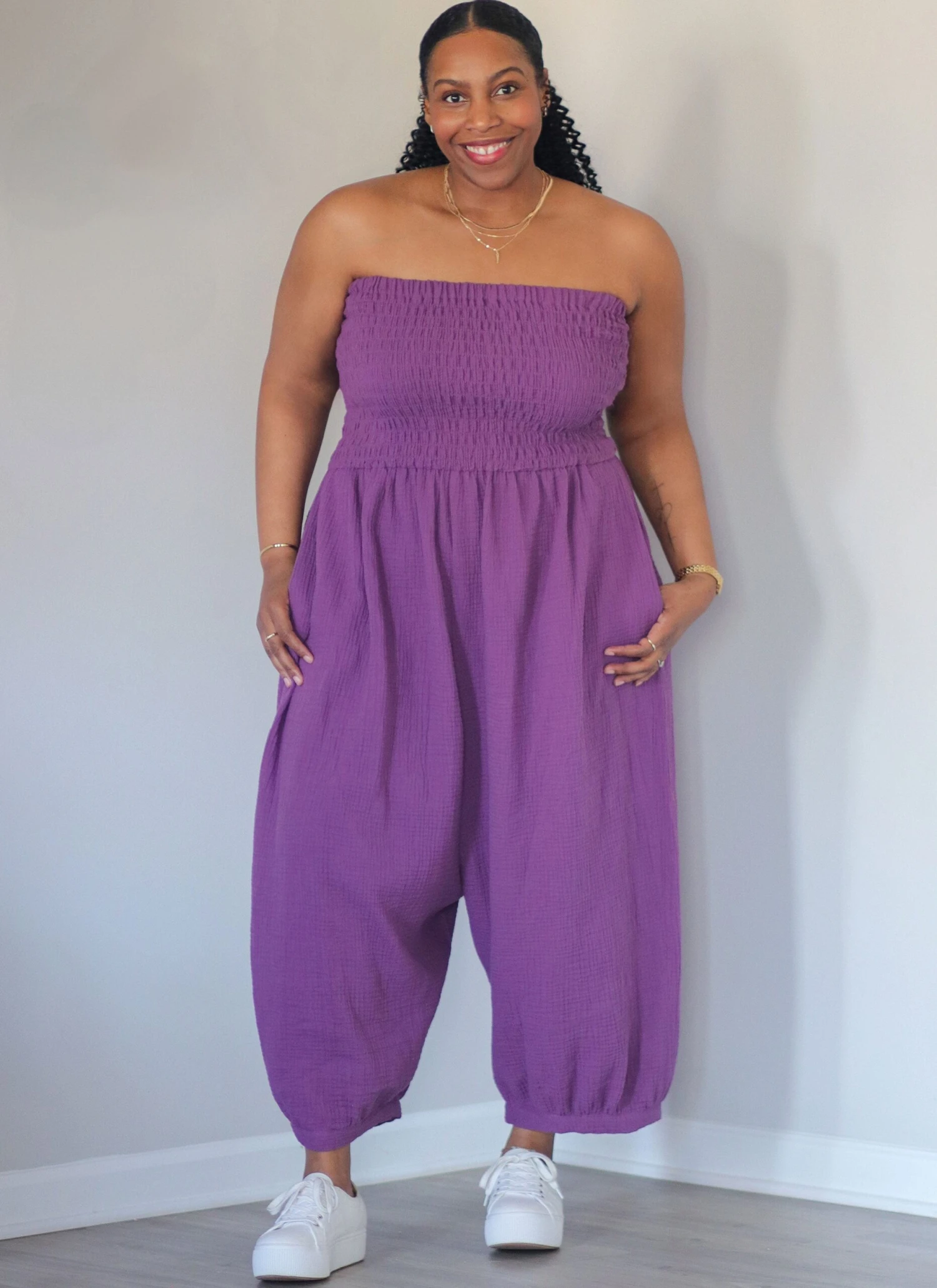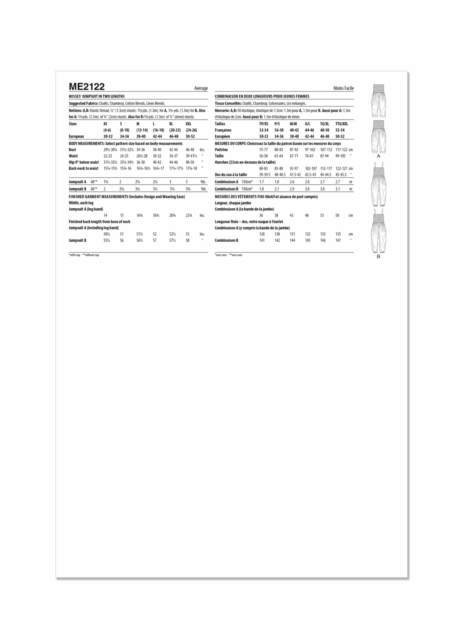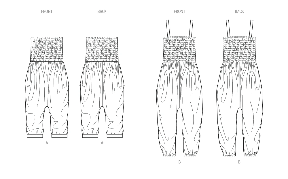 Sewing pattern for Pull-on harem jumpsuit in two lengths has sleeveless or shoulder straps option, shirring bodice and side seam pockets. View B has ruffle at neckline.