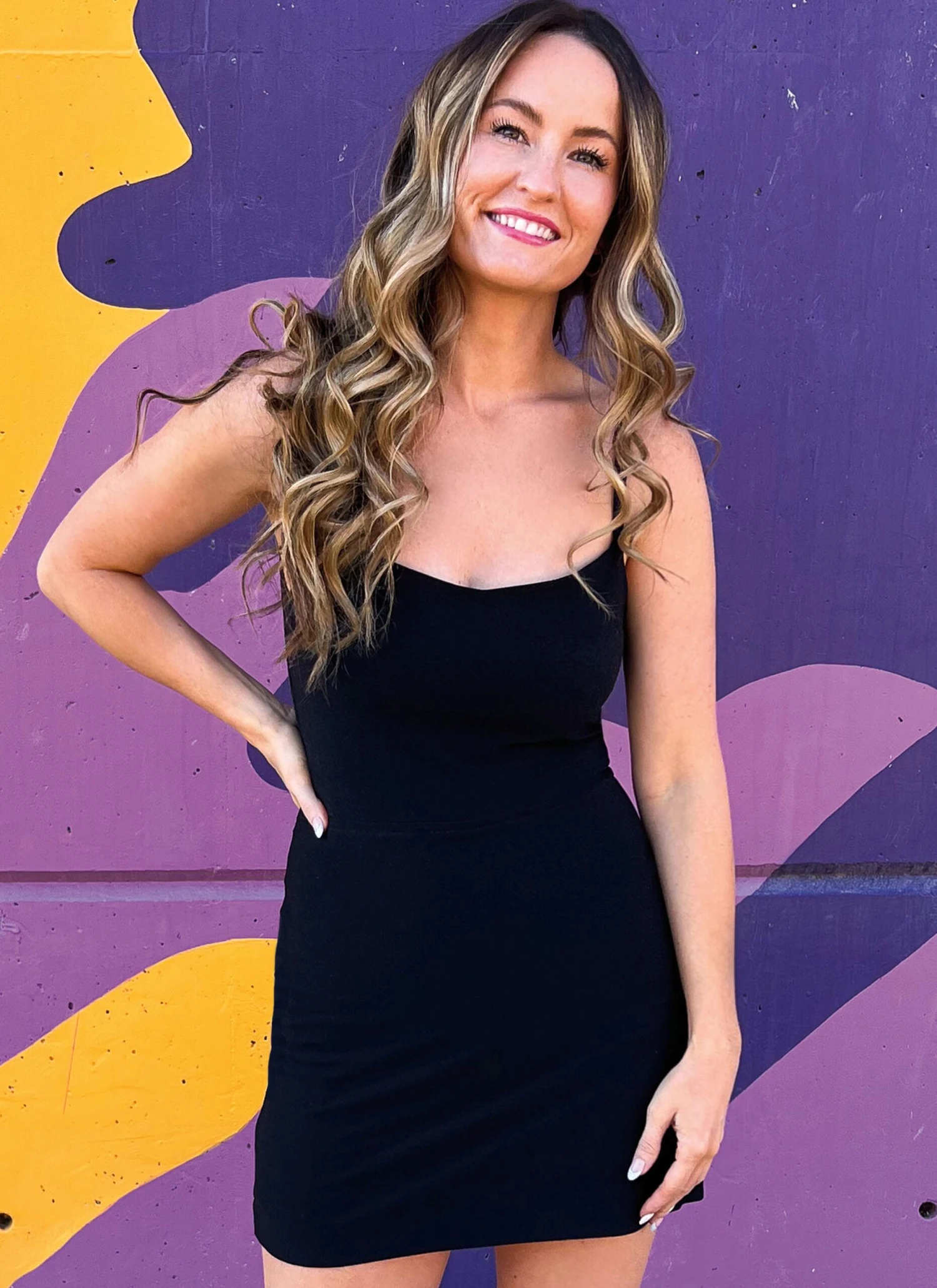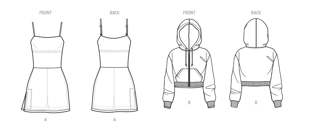 Sewing pattern for Soft knit tennis dress with adjustable straps has inside shelf bra and built in shorts underneath dress. Shorts have a pocket on the leg. Pair it with the cropped zip up hoodie to complete the look! Hoodie has ties, front pockets and rib knit cuffs and waist band.