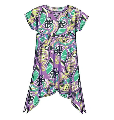 WOMEN’S TOP, TUNIC, DRESS, SHORTS AND PANTS: Pullover top, tunic and dress have front and back extending into sleeves and narrow hem. A: very loose-fitting, bias neck binding, yoke back extends into sleeves, back pleats, and attached tie ends. B: shaped hemline, wrong side may show, and side slits. C: shoulder slits. B and C: loose-fitting. Semi-fitted, straight-legged shorts and pants have elastic waist and stitched hems. Designed for Lightweight Woven Fabrics.