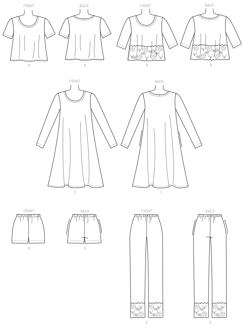 A, B, C: Very loose-fitting button front tops have dolman sleeve variations. D, E: Semi-fitted pull on pants have elasticized waist and front pockets. A, D, E:Double-fold bias tape.