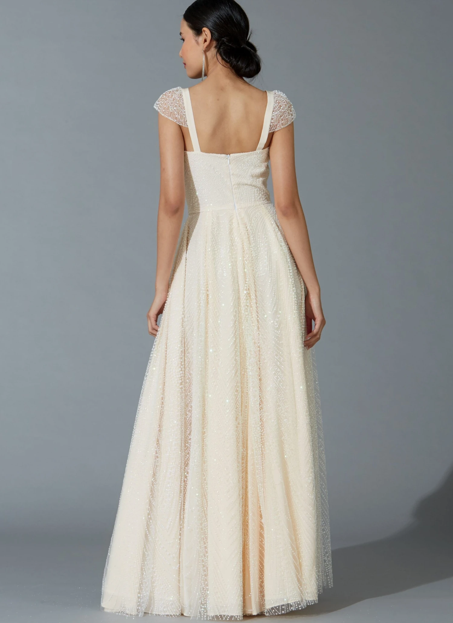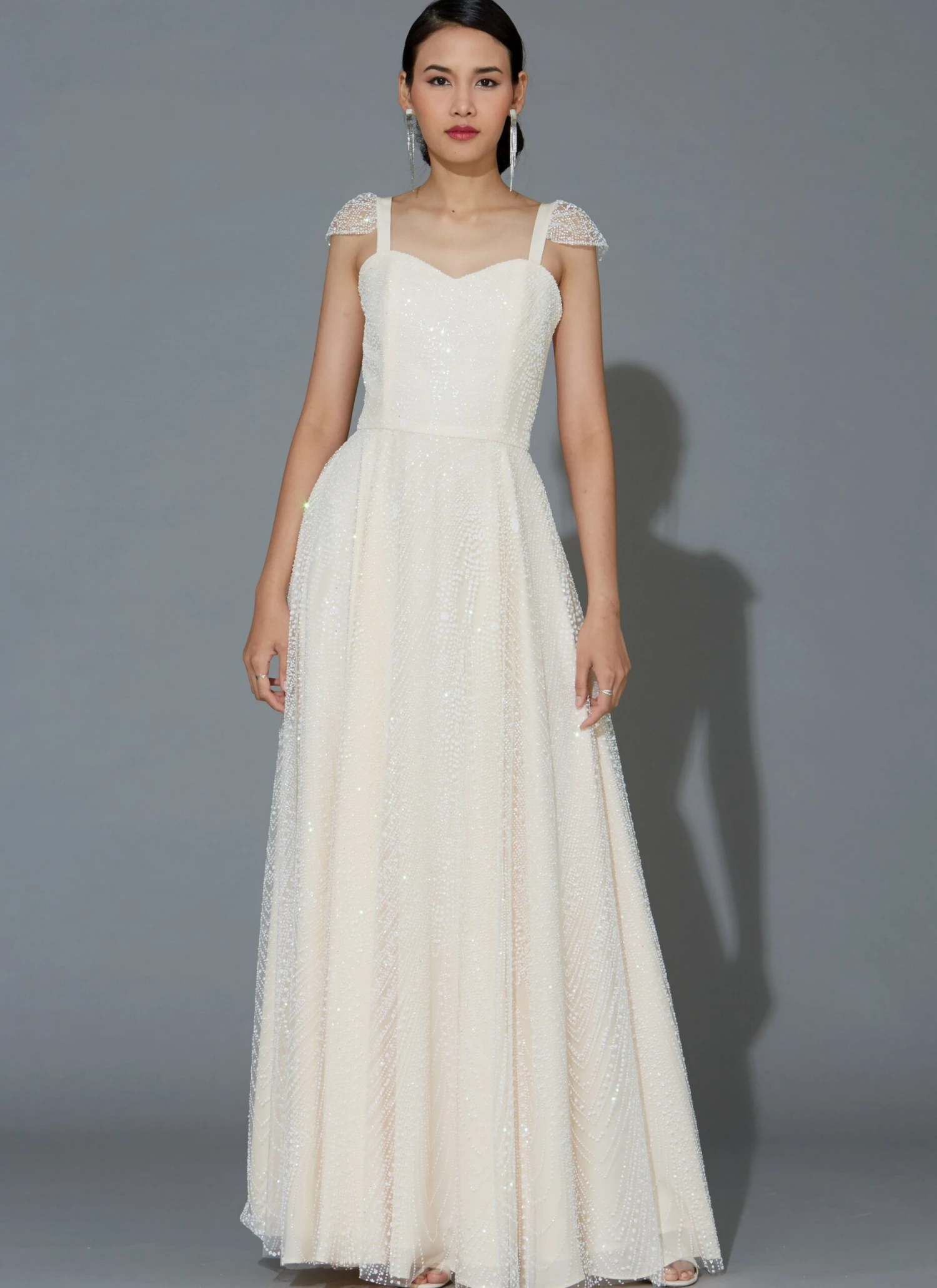 Close fitting lined dresses have princess seams and strap variations. Perfect for special occasions and weddings. A: Contrast overlay. C, D: Uneven hemline, wrong side of fabric will show. Includes separate pattern pieces for A/B, C, and D cups.