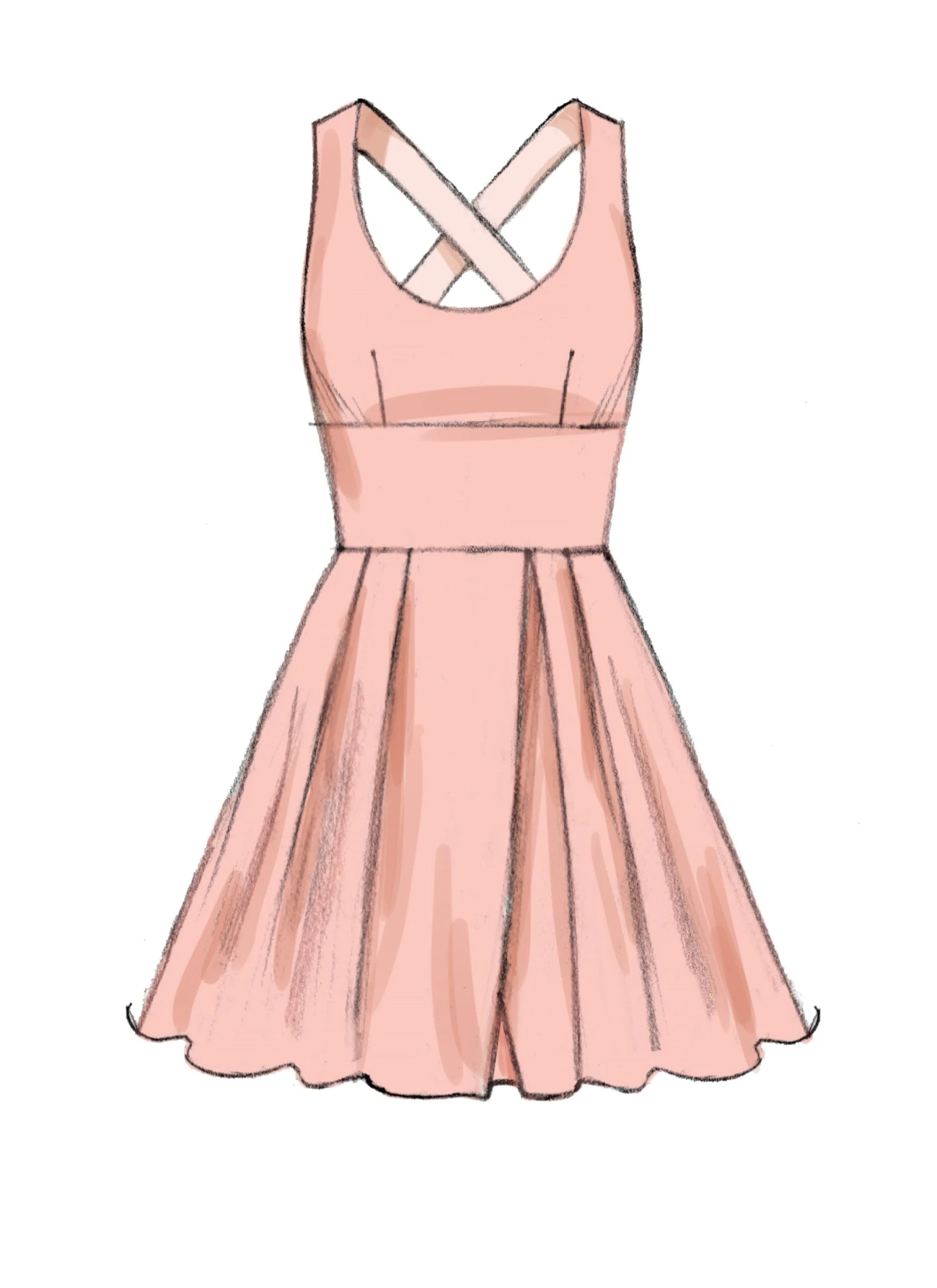 Close fitting lined dresses have bodice and skirt variations. Create your own design with mix and match pattern pieces. Design options include: scoop neck bodice, bra bodice, off the shoulder bodice, pleated skirt, and straight skirt.