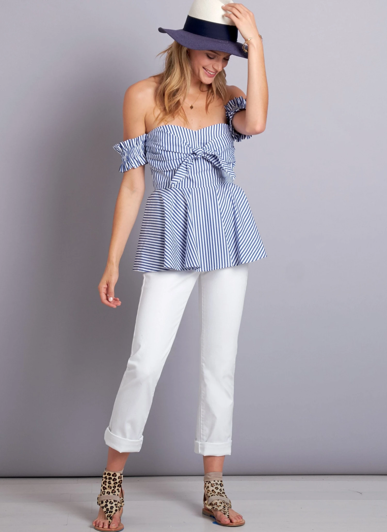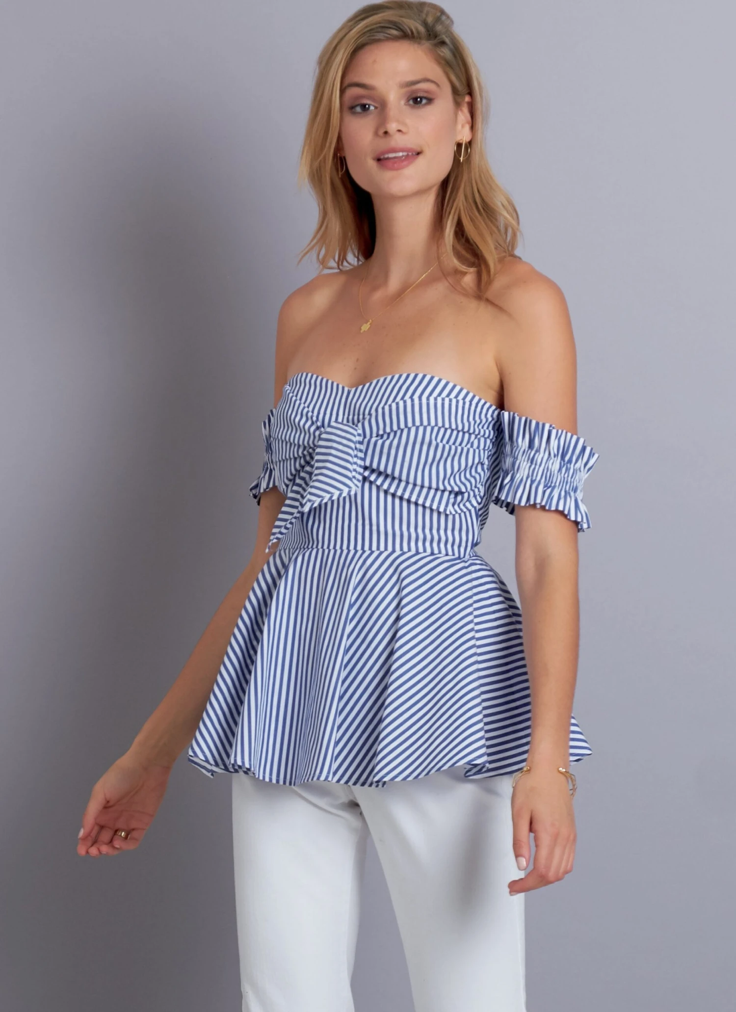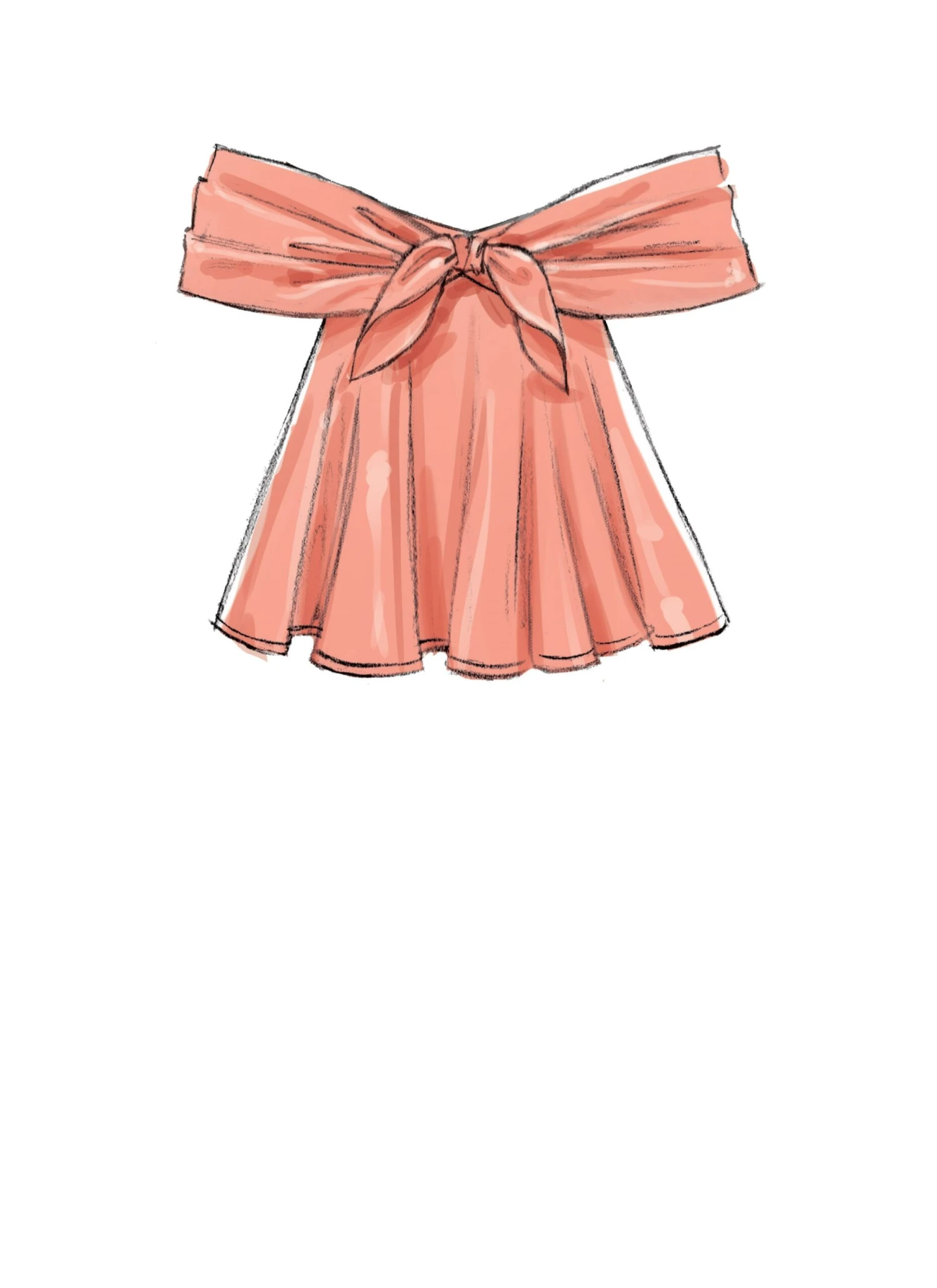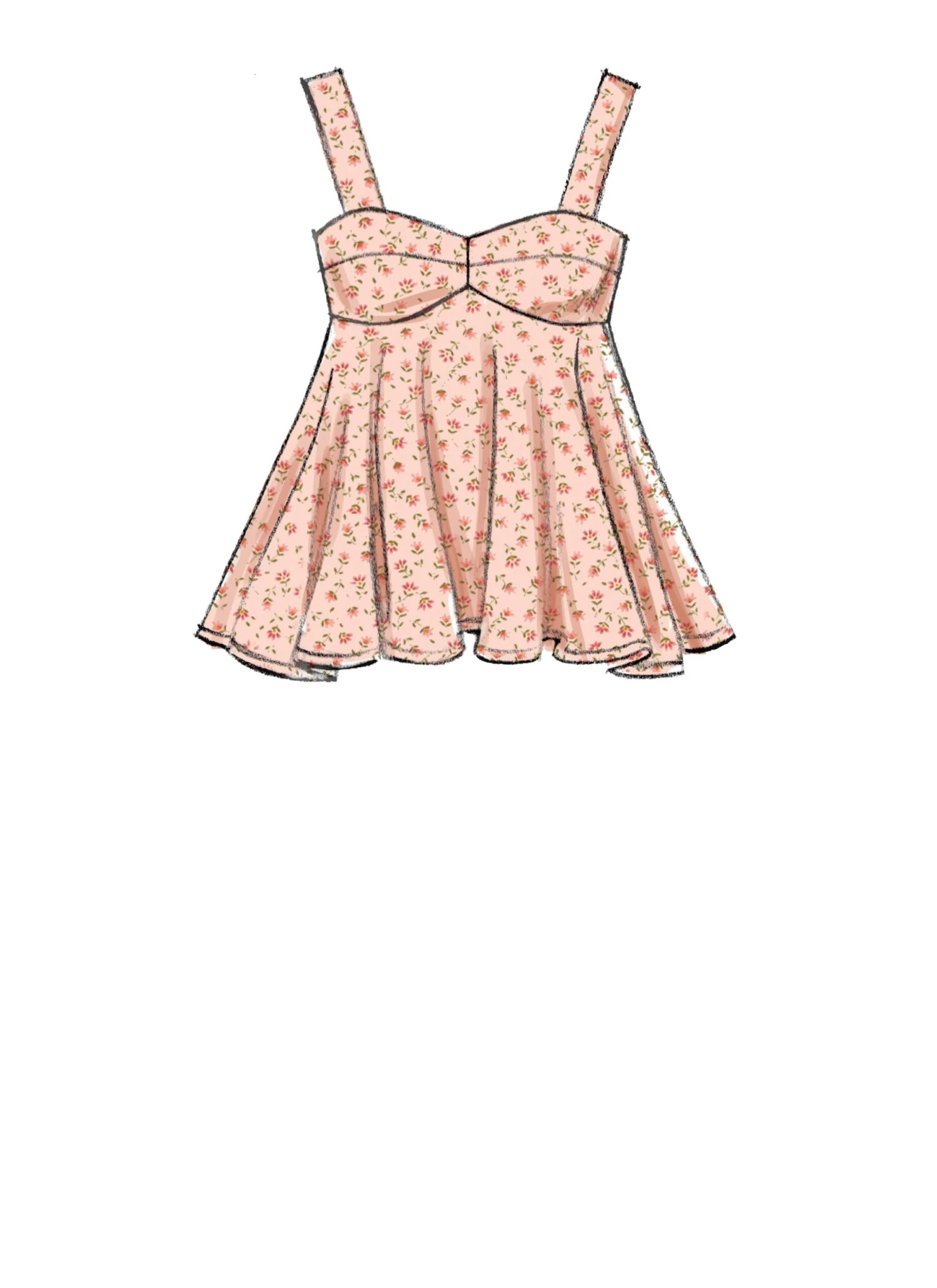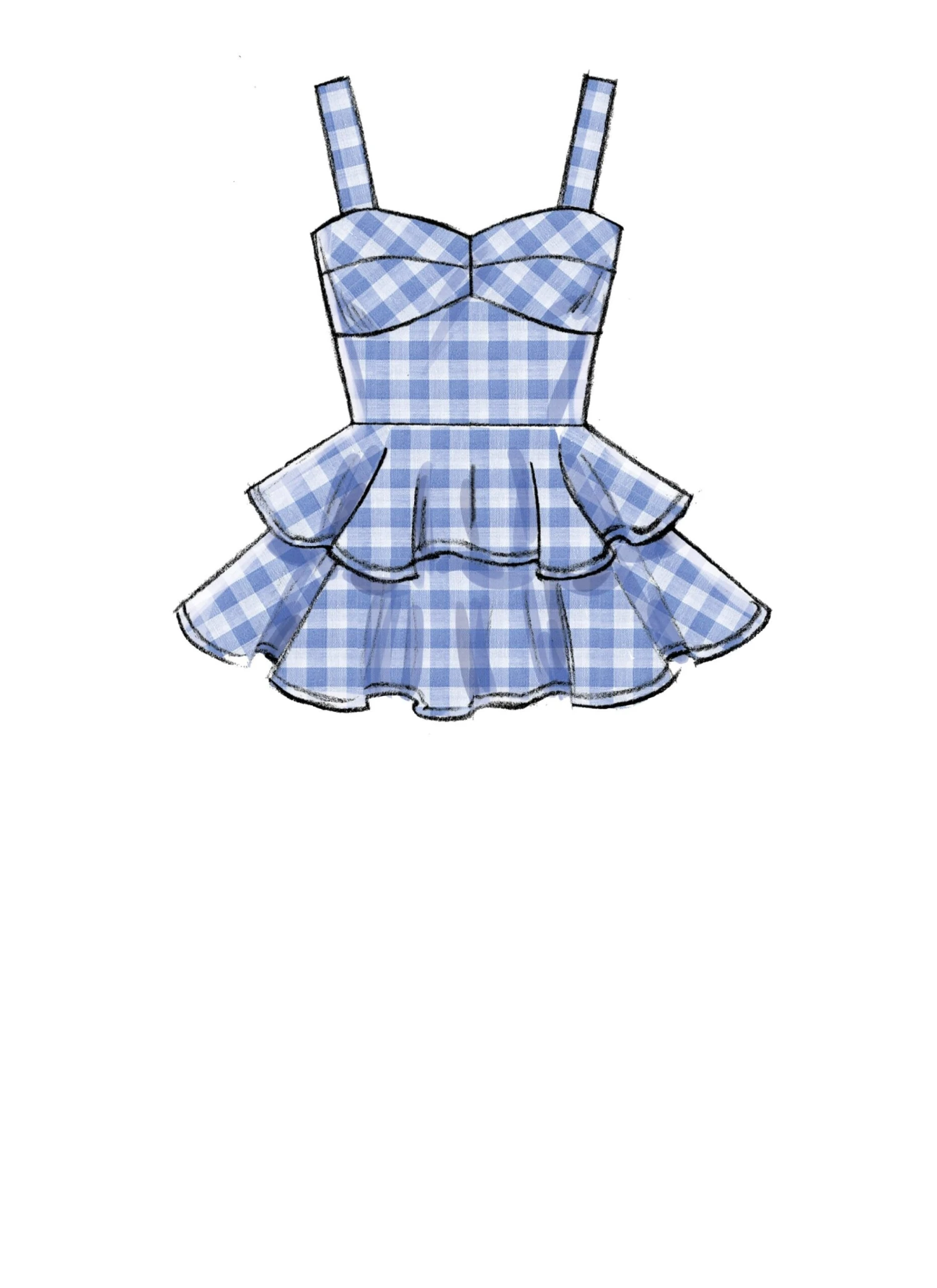 Close fitting, partially lined tops have boning, invisible zipper, and bodice variations with sleeves or straps. Create your own design with mix and match pattern pieces. Design options include: Bra, knot bodice overlay, cape, straps, sleeves, midriff and peplum, midriff with upper and lower peplums, and flounce.