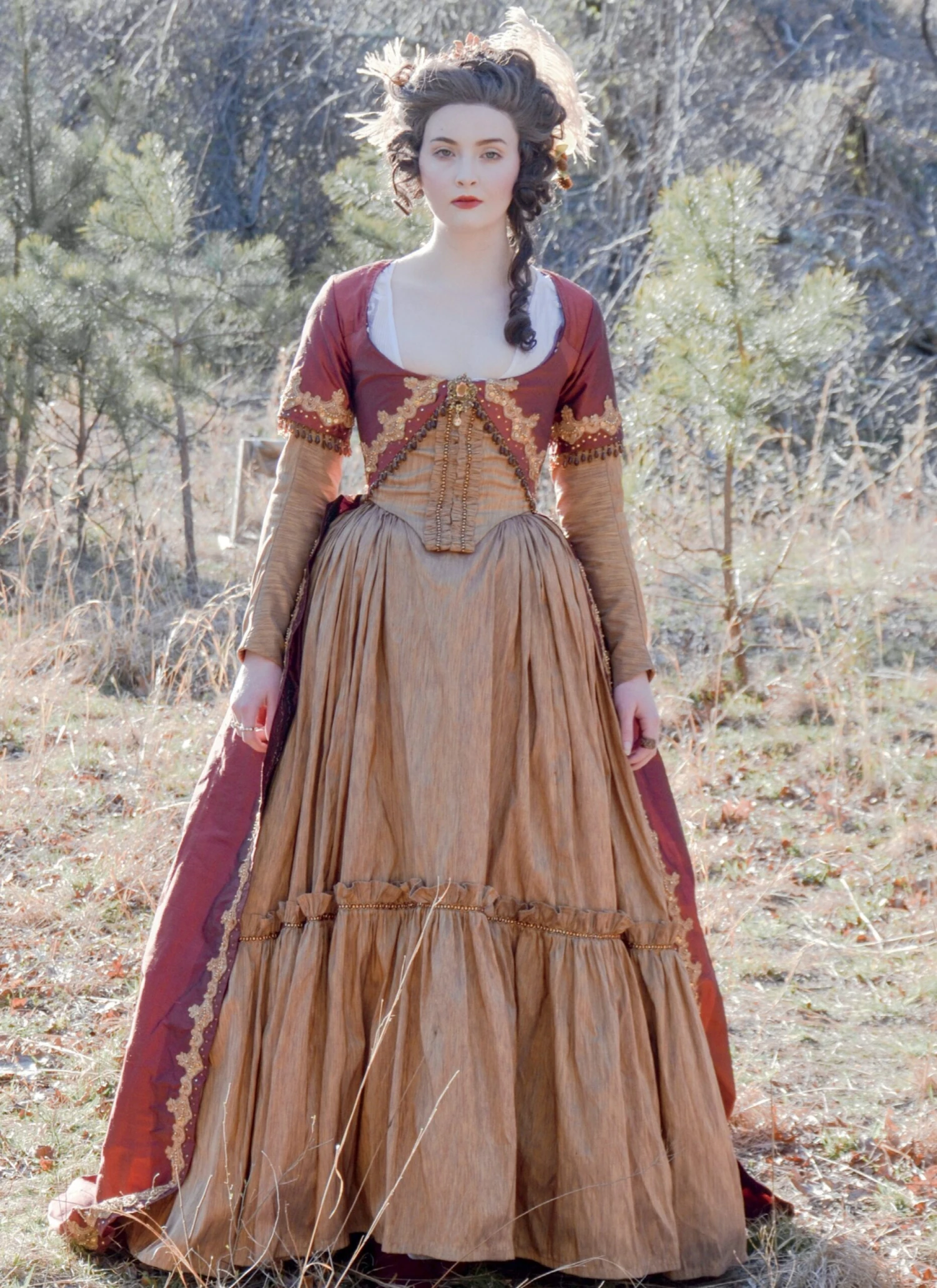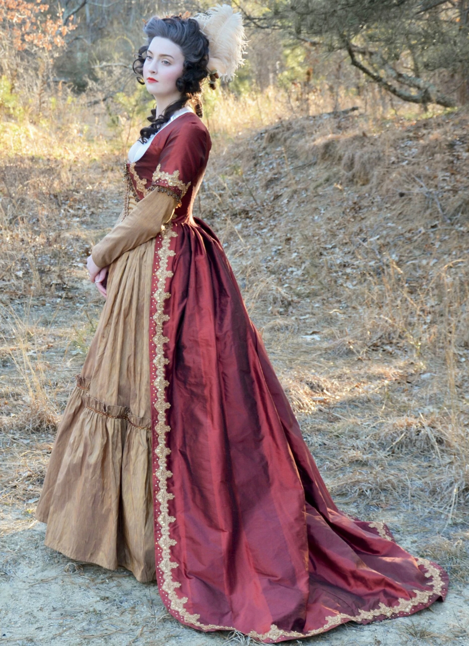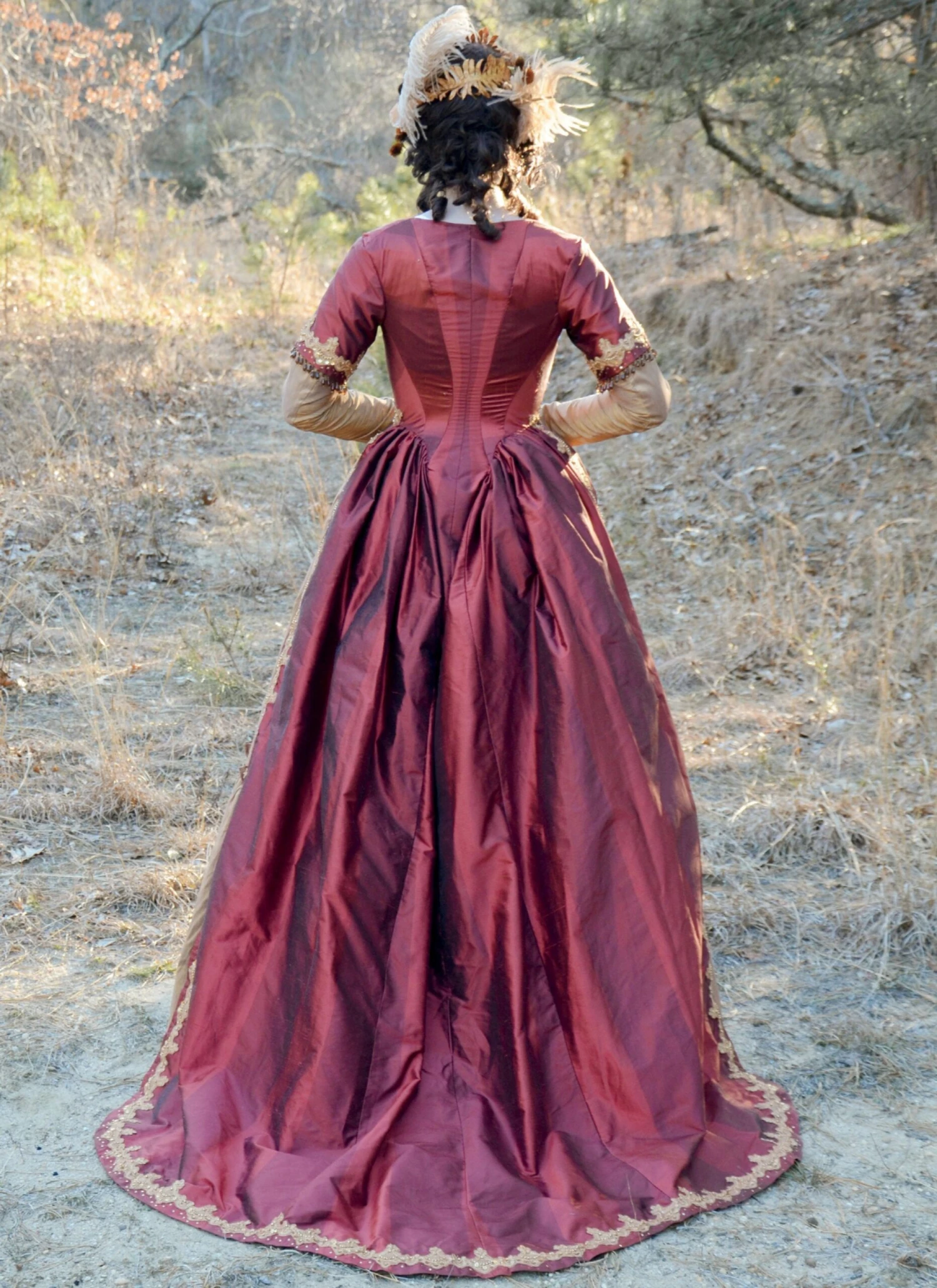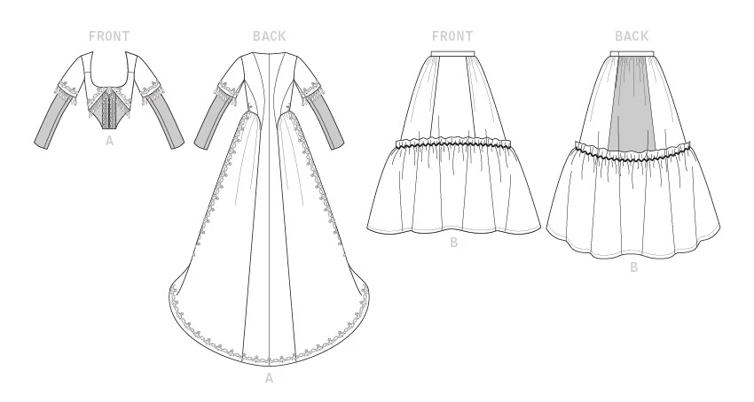 Boned, partially lined (bodice) Robe A has front hook and eye closures and back that extends into train. Gathered Skirt B has waistband with hook and eye closures and ruffles. Both views have purchased trims.