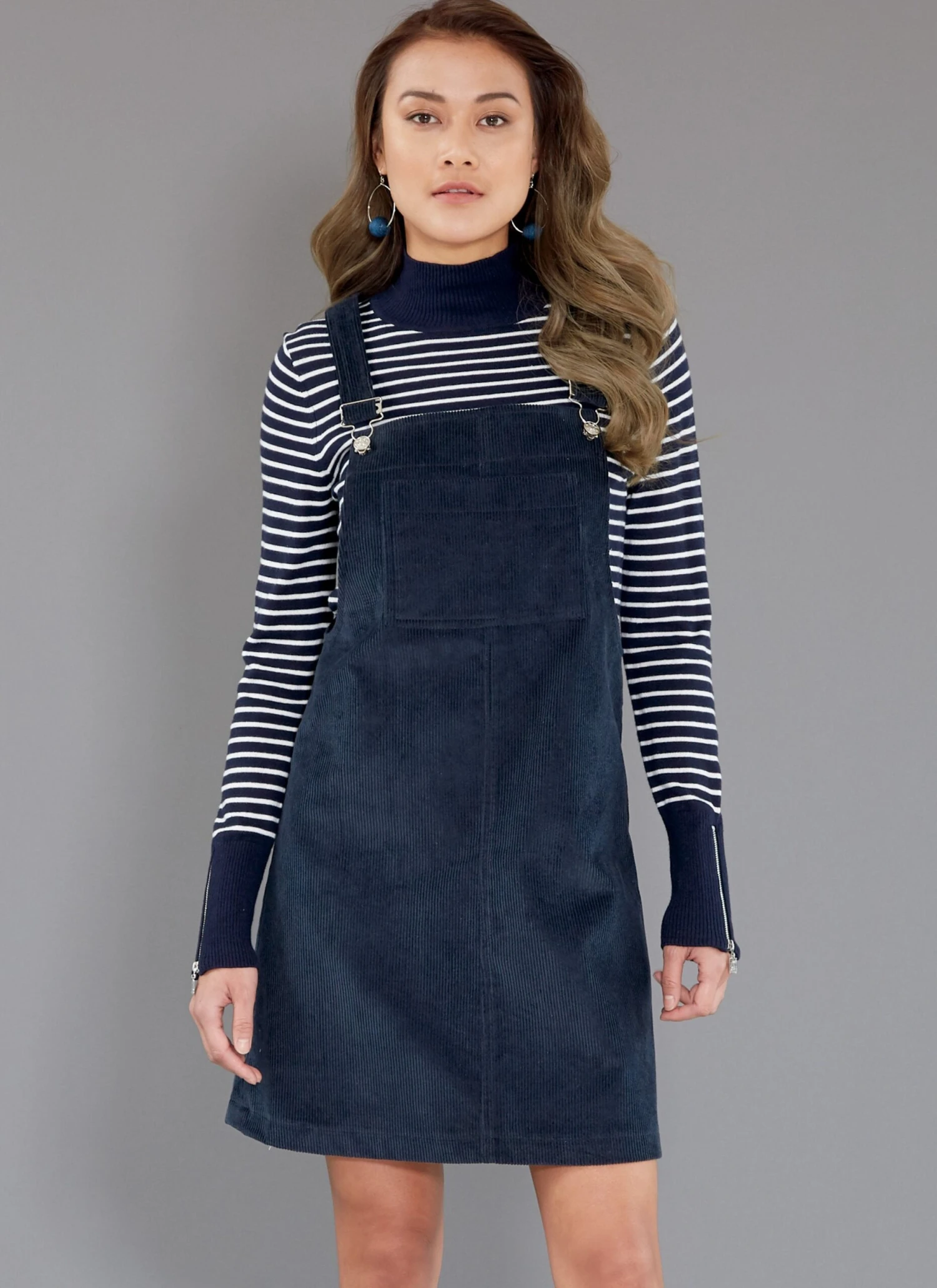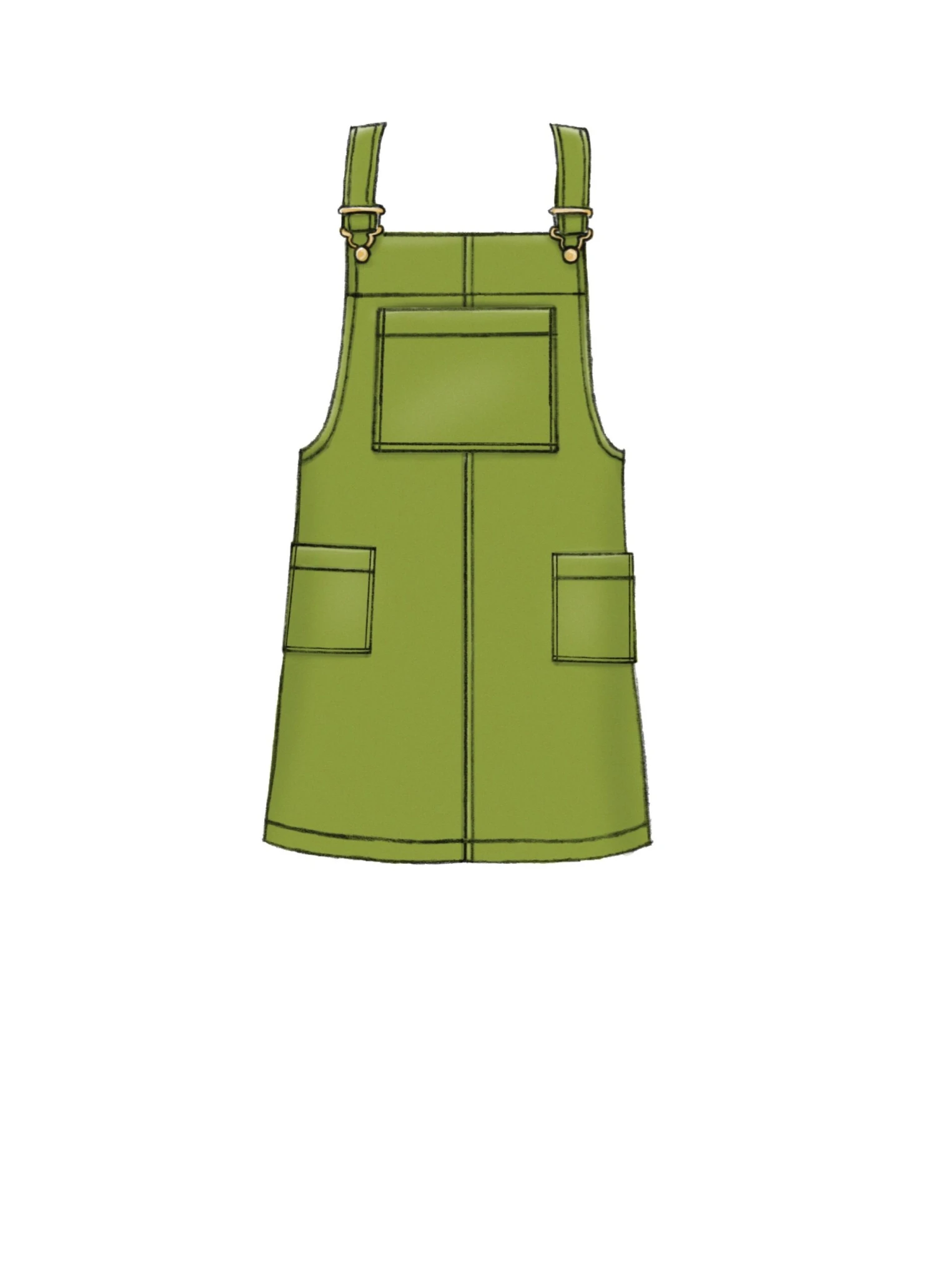 All jumpers have adjustable straps which fasten with purchased overall buckles. B, C, D: Pockets.