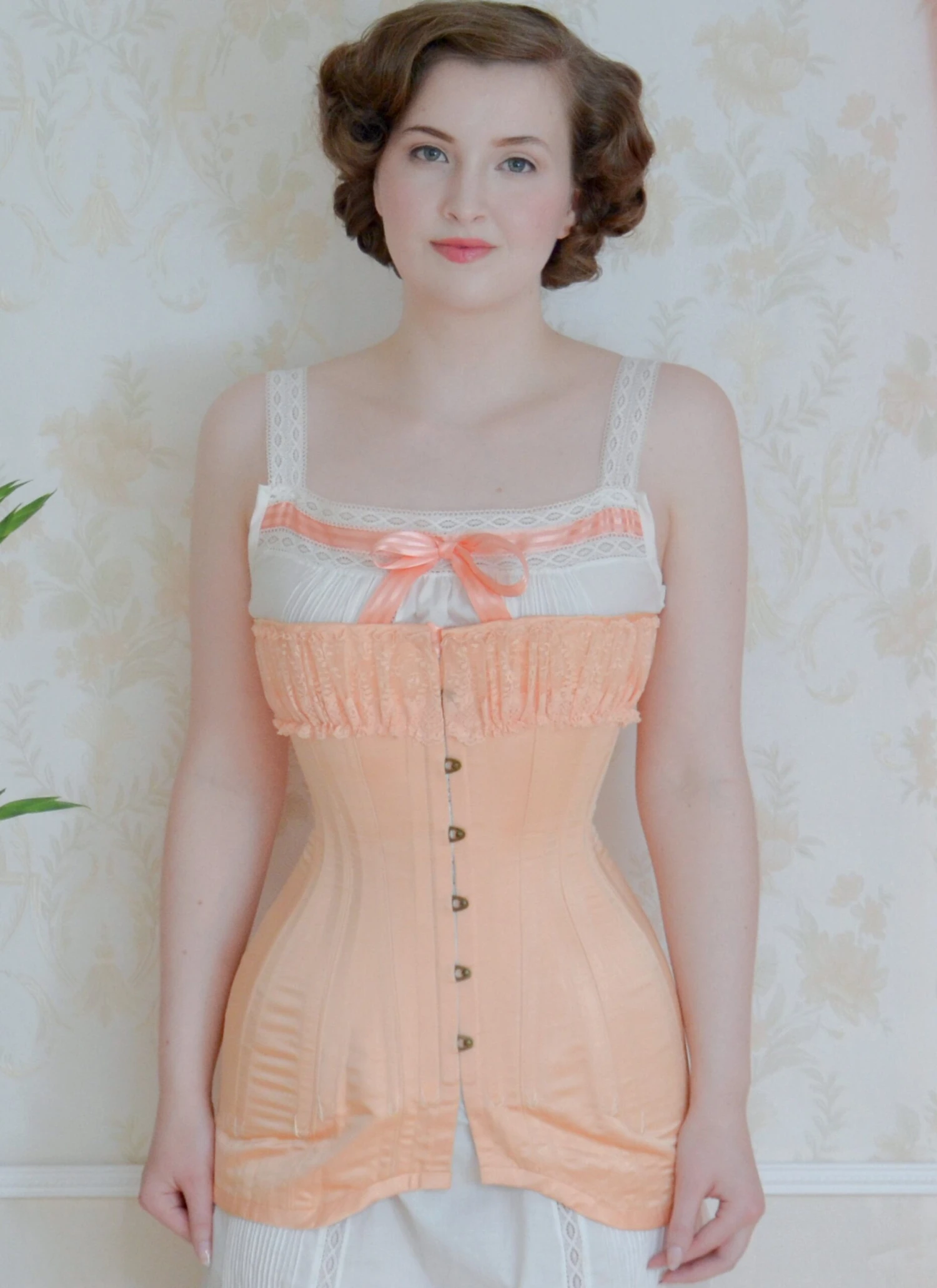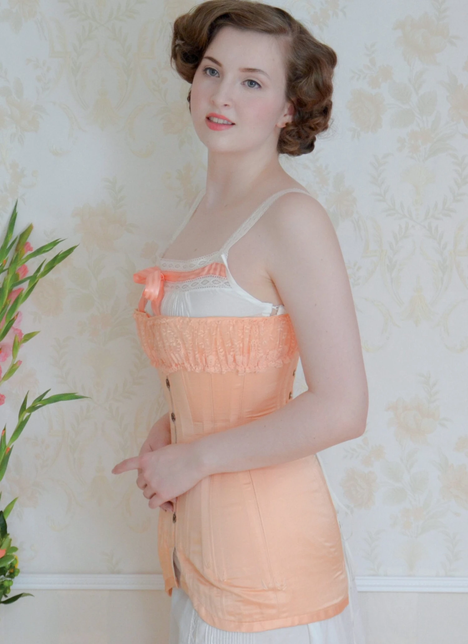 Chemise A is loose-fitting and has side front tucks, self binding at underarm, side hook and eye and ribbon tie closure, and purchased lace trim and ribbon details. Longline Corset B is fully underlined with front busk, back lacing, steel boning, waist stay, and gathered lace detail at bust.