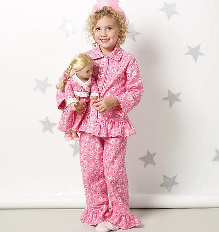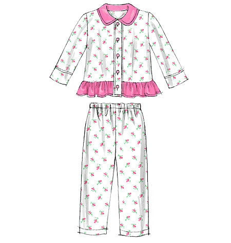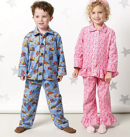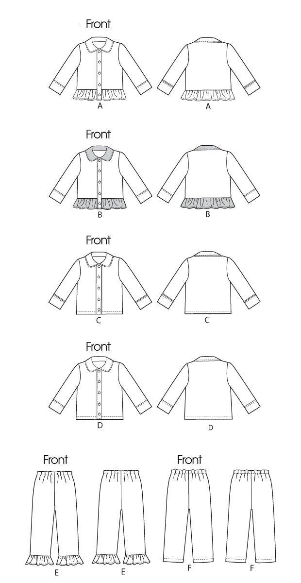 TODDLERS’/CHILDREN’S TOPS AND PANTS: Tops have collar, front button band and bias sleeve bands. A and C: purchased piping. Pants have elastic waist. A,B and E: ruffles with narrow hem. C,D and F: stitched hems. Note: The garments in this pack are not intended for sleep apparel. Designed for soft, lightweight woven fabrics. SUGGESTED FABRICS: Flannels, Cotton Blends, Satins. NOTIONS: A,B,C,D: Five 5/8″ Buttons. A,C: 23/8 yds. of 1/8″ Piping Trim. E,F: 3/4 yd. of 3/4″ Elastic. * With Nap **Without Nap ***With or Without Nap Combinations: CB(1-2-3), CF(4-5-6)